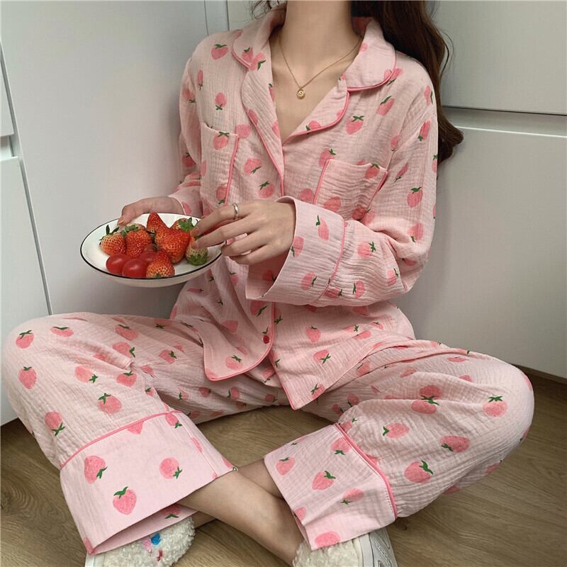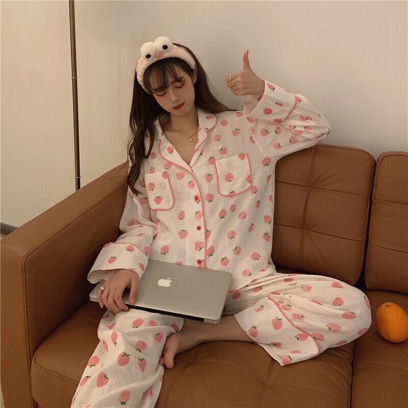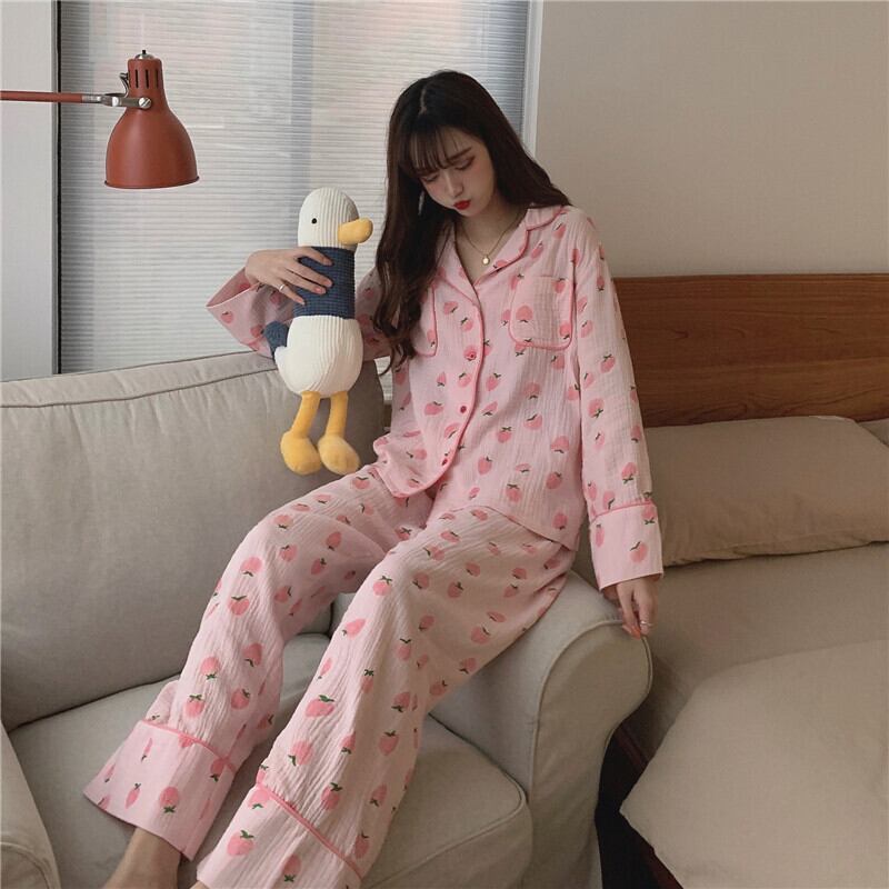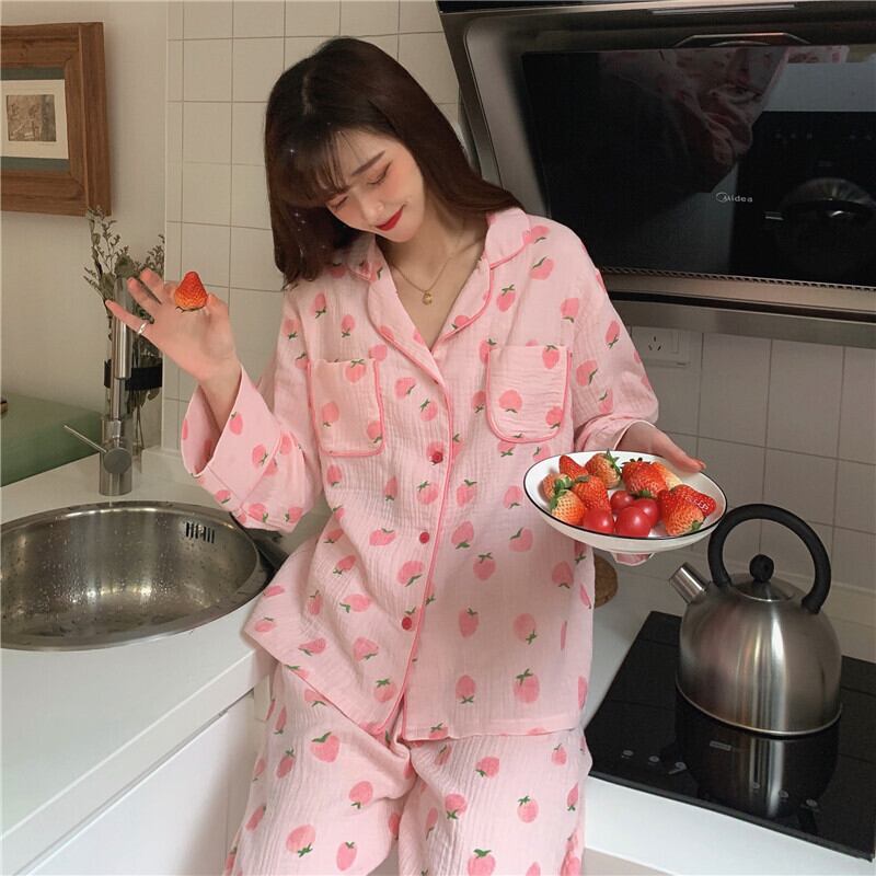 2020年春長袖パンツパジャマセット女性のルーズフルーツプリントバブルコットンホームウェア クレセントシティ78842392902