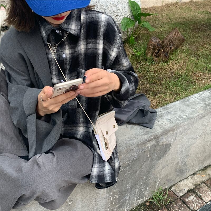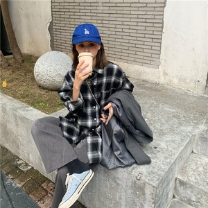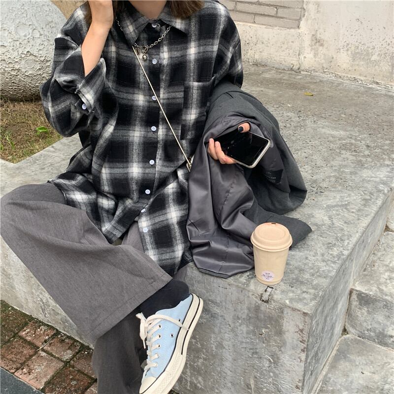 黒と白のチェック柄シャツ女性デザインセンスニッチ初秋2020新しいレトロチェック柄ラペルルーズシャツ クレセントシティ79285705749