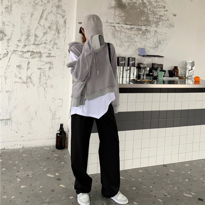 色:白いTシャツ,黒いズボン,グレーのセーター,黒いセーター