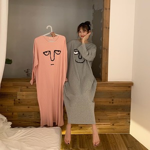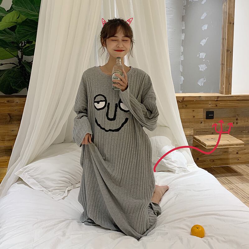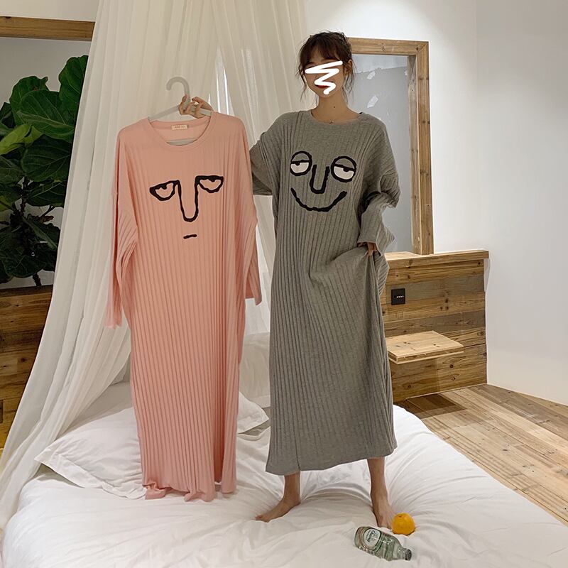 ゆるい怠惰な風ミドル丈パジャマホームサービス女性の春と秋の漫画プリントロング膝丈パジャマドレストレンド クレセントシティ77474732428