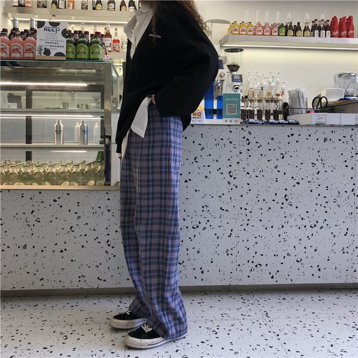 チェック柄パンツ女性の2020年秋の新しいカジュアルパンツバージョンの小さい、緩い、薄い、ハイウエスト、ワイドレッグストレートモップパンツ クレセントシティ66943098954