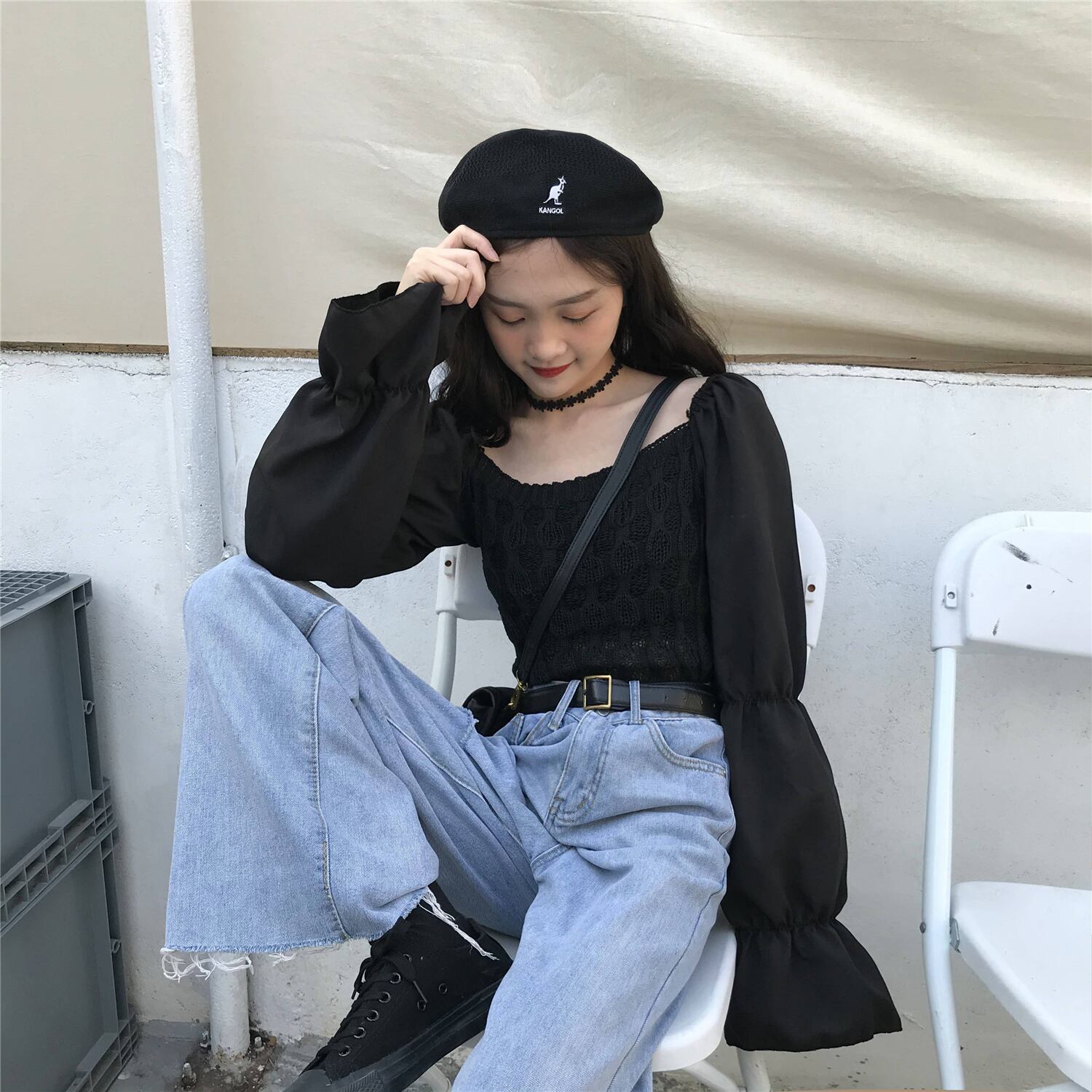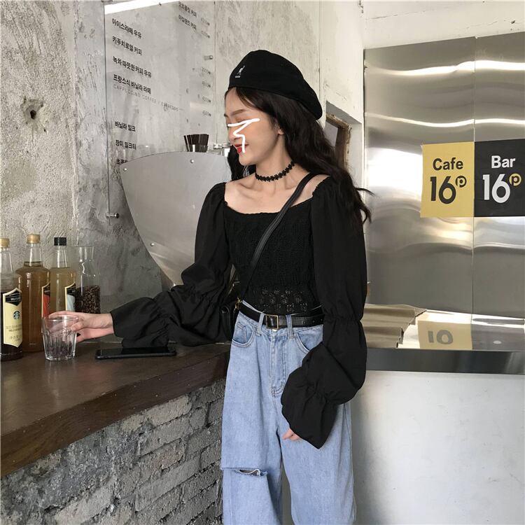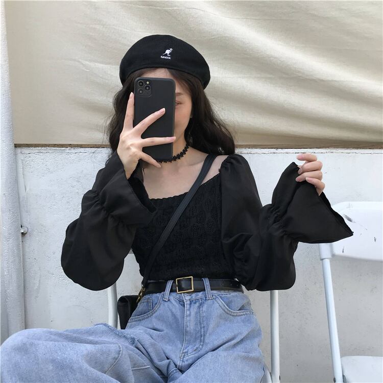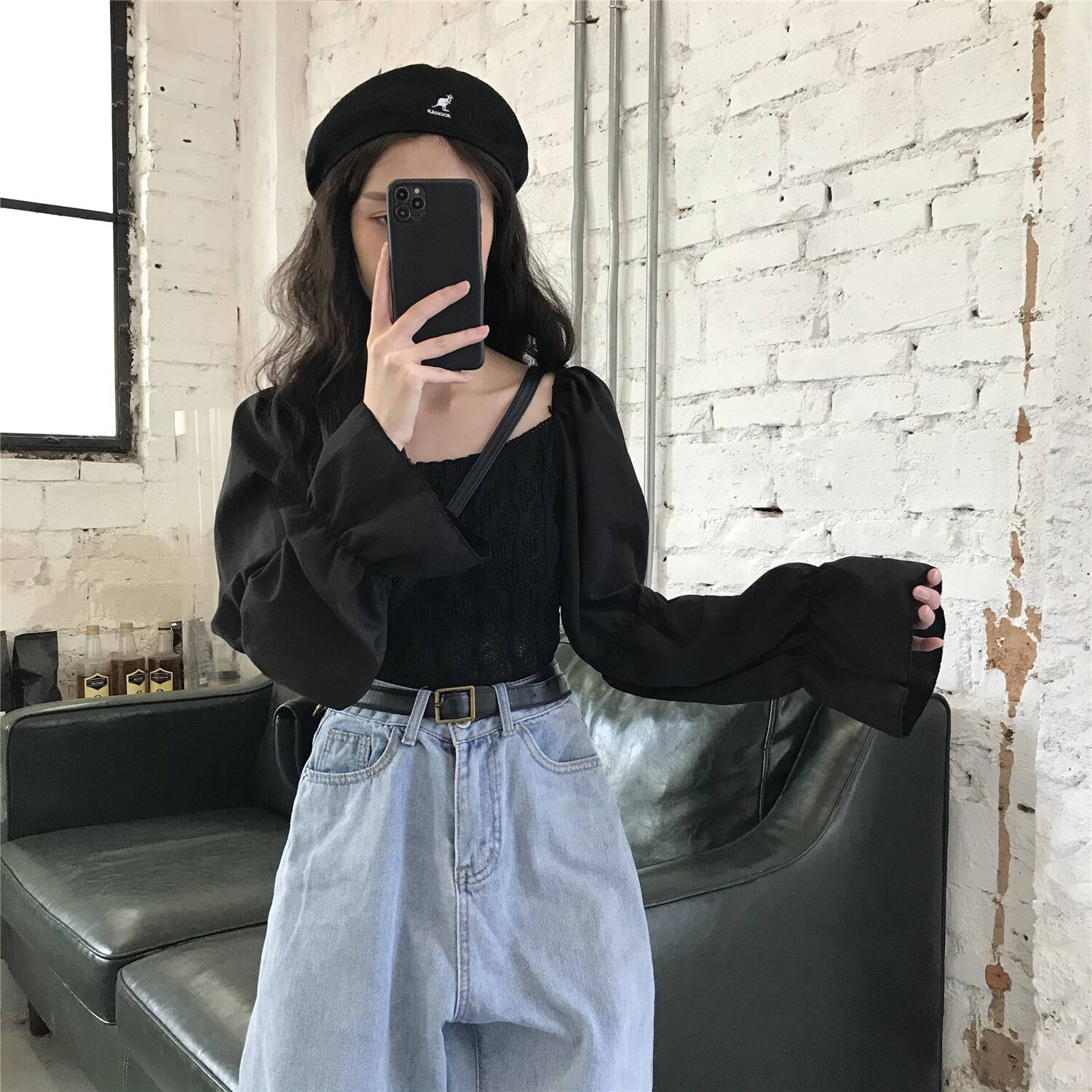 トランペットスリーブブラックシャツの女性のレトロな香港のフレーバー春の新しいバージョンの四角い襟のすべてのマッチのHyunaスタイルのクロップドトップ女性 クレセントシティ66804177560