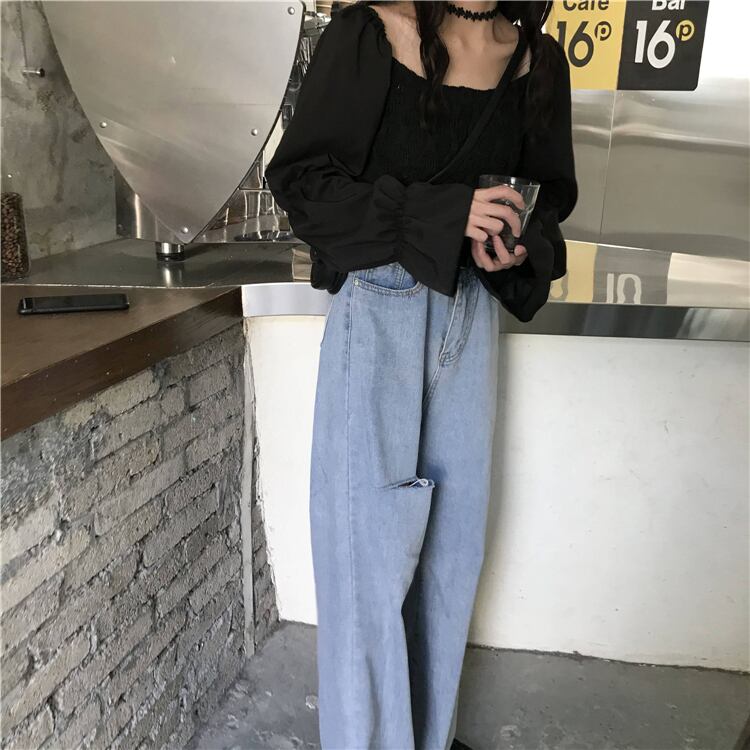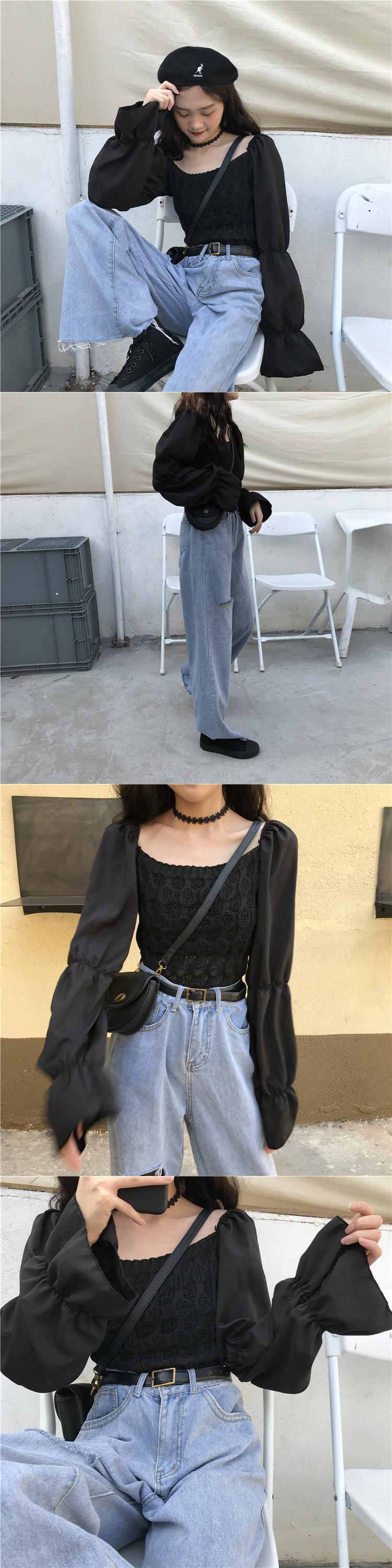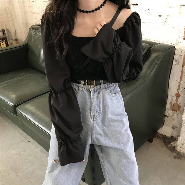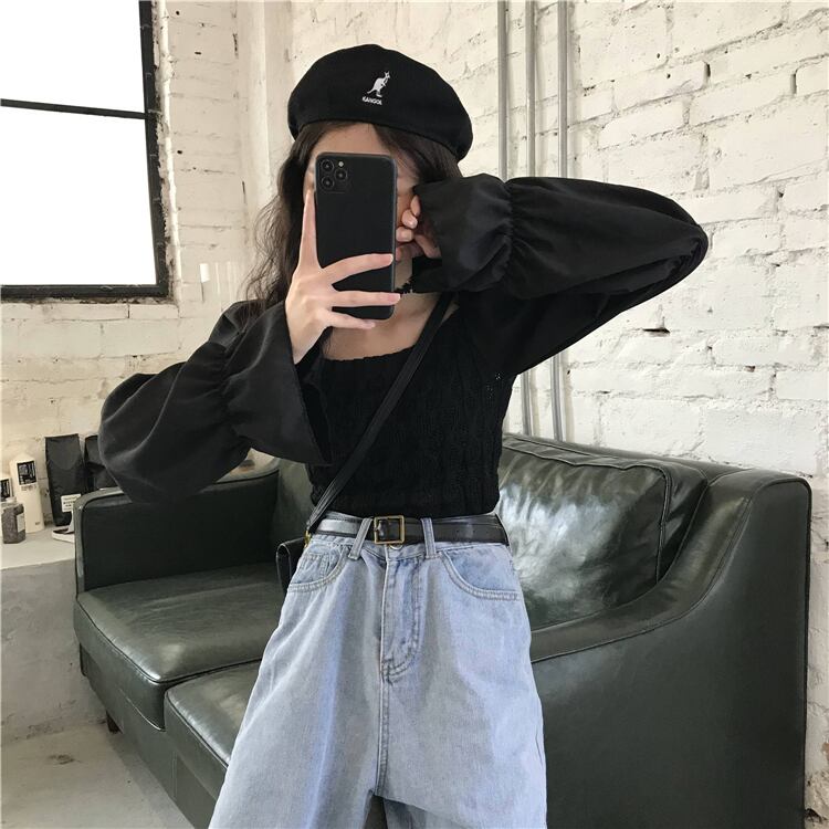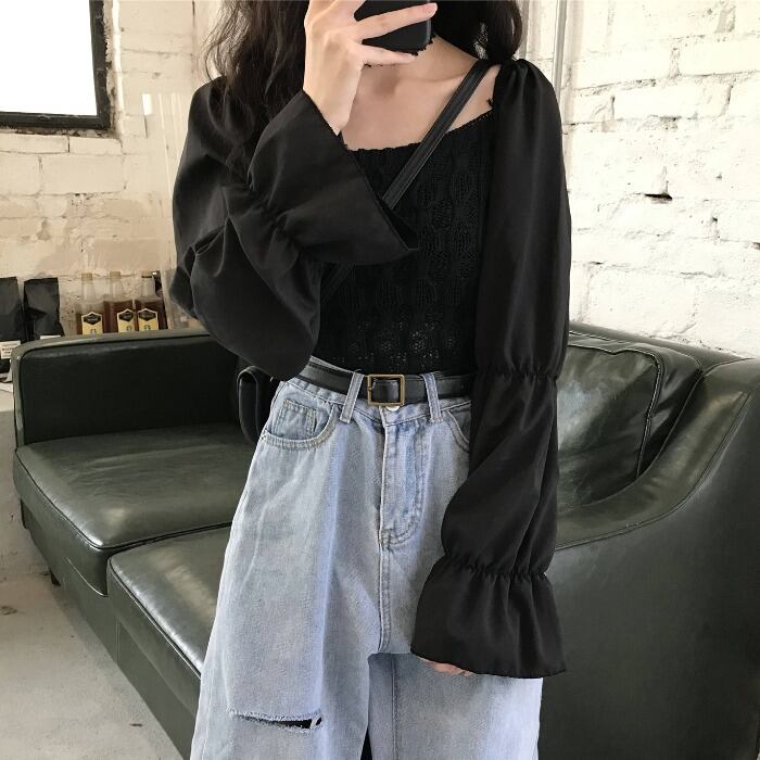 トランペットスリーブブラックシャツの女性のレトロな香港のフレーバー春の新しいバージョンの四角い襟のすべてのマッチのHyunaスタイルのクロップドトップ女性 クレセントシティ66804177560