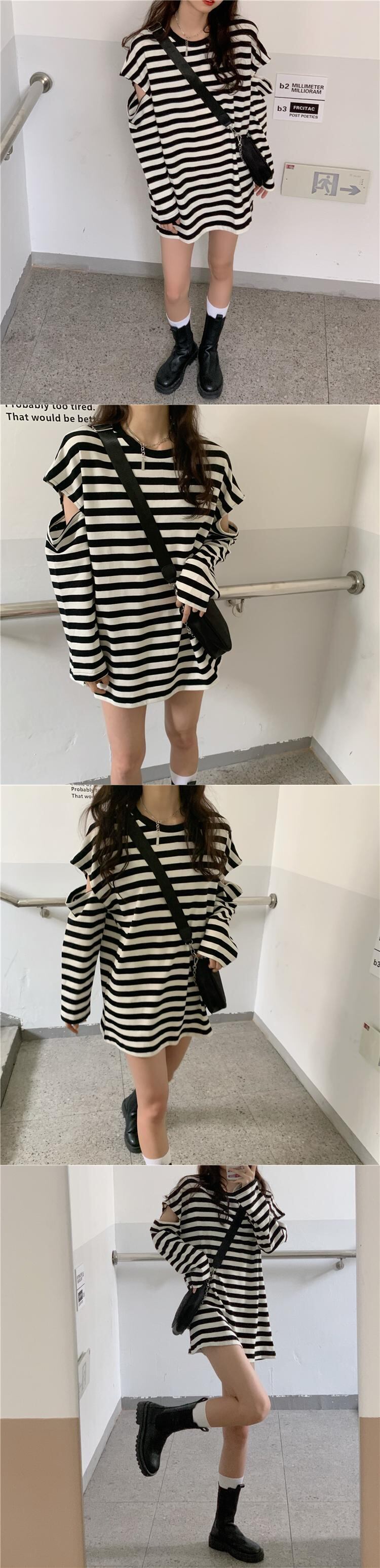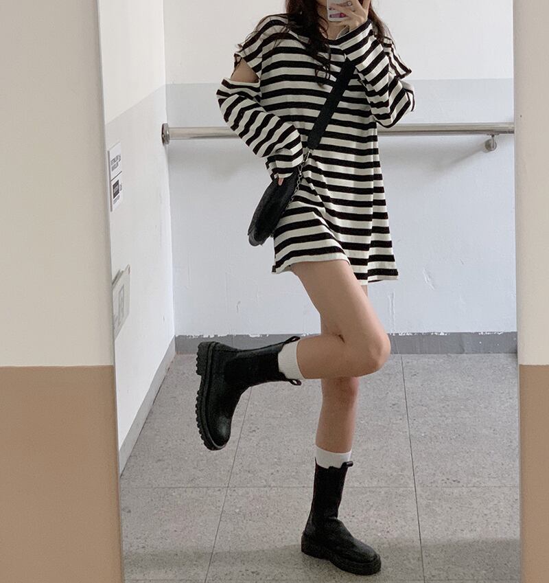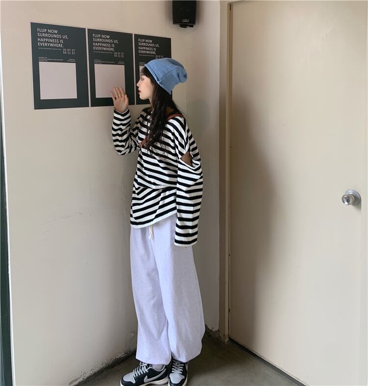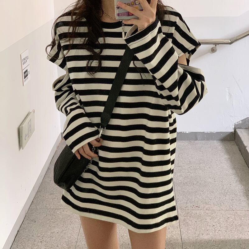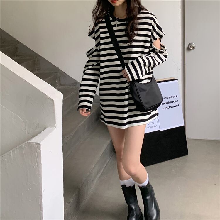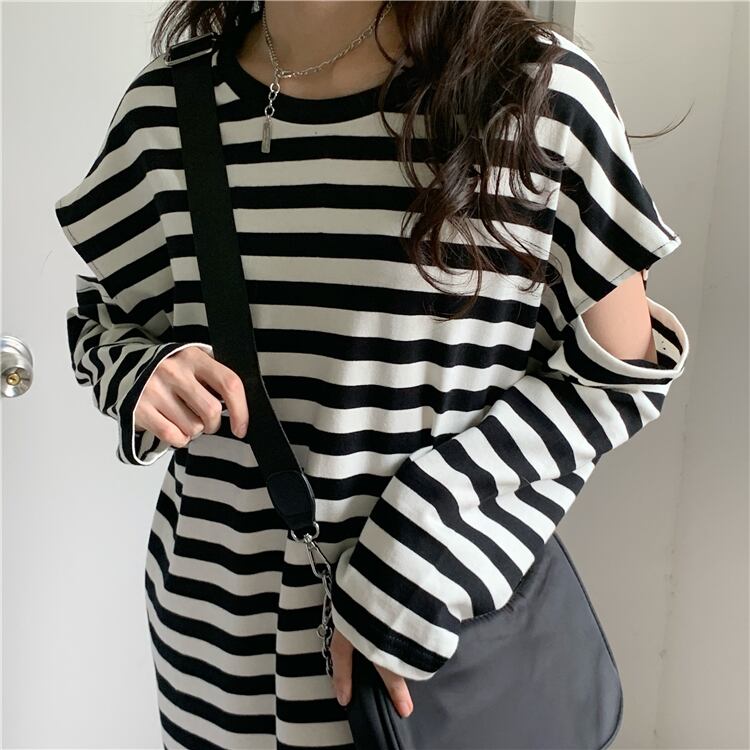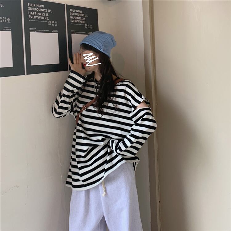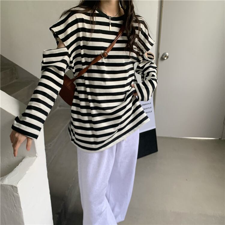 ストライプロングスリーブTシャツレディース2020年秋の新スタイルデザインオフショルダーミドル丈レイジースタイルアウタージャケット クレセントシティ53576267389