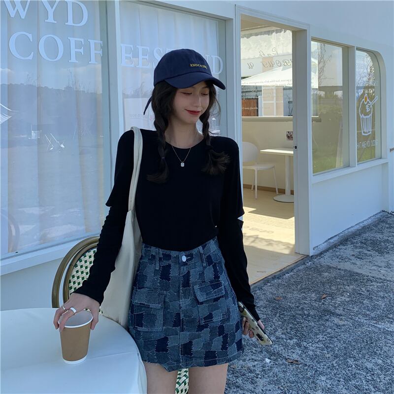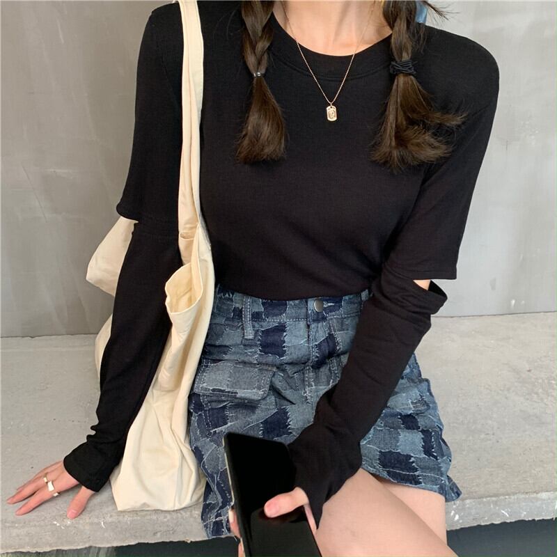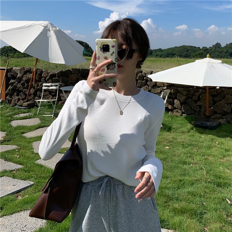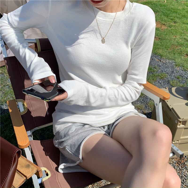 ハーフハイトラウンドネックソリッドカラー長袖Tシャツレディース2020年初秋の新しい慎重な機械設計センスホールトップイン クレセントシティ69664185979
