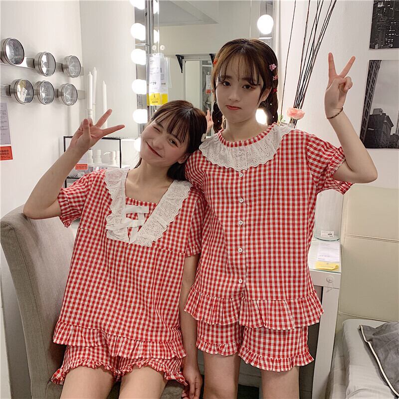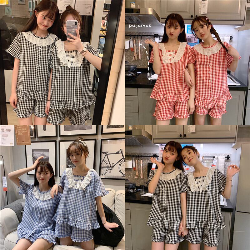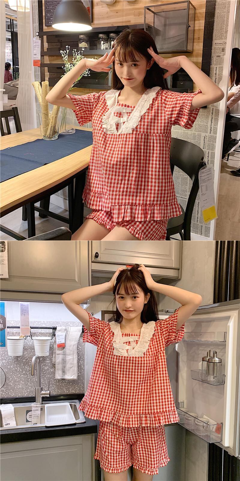 チェック柄パジャマ女性の夏2020新しい甘くてかわいいプリンセススタイル半袖ショーツホームサービスツーピーススーツ クレセントシティ45784700998