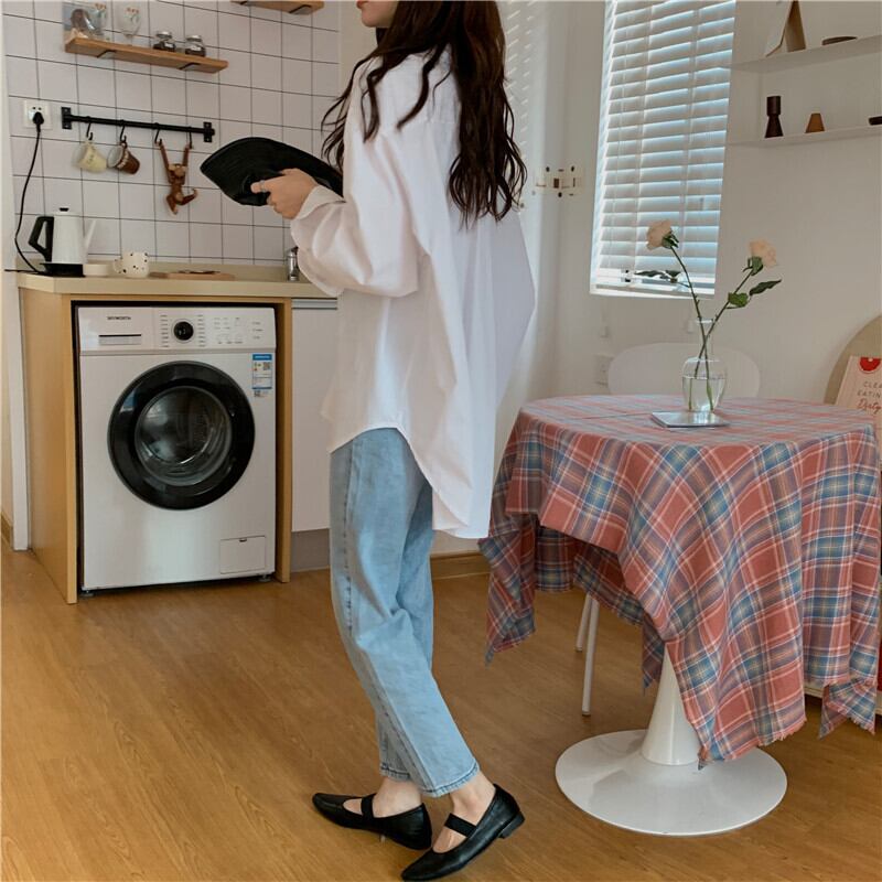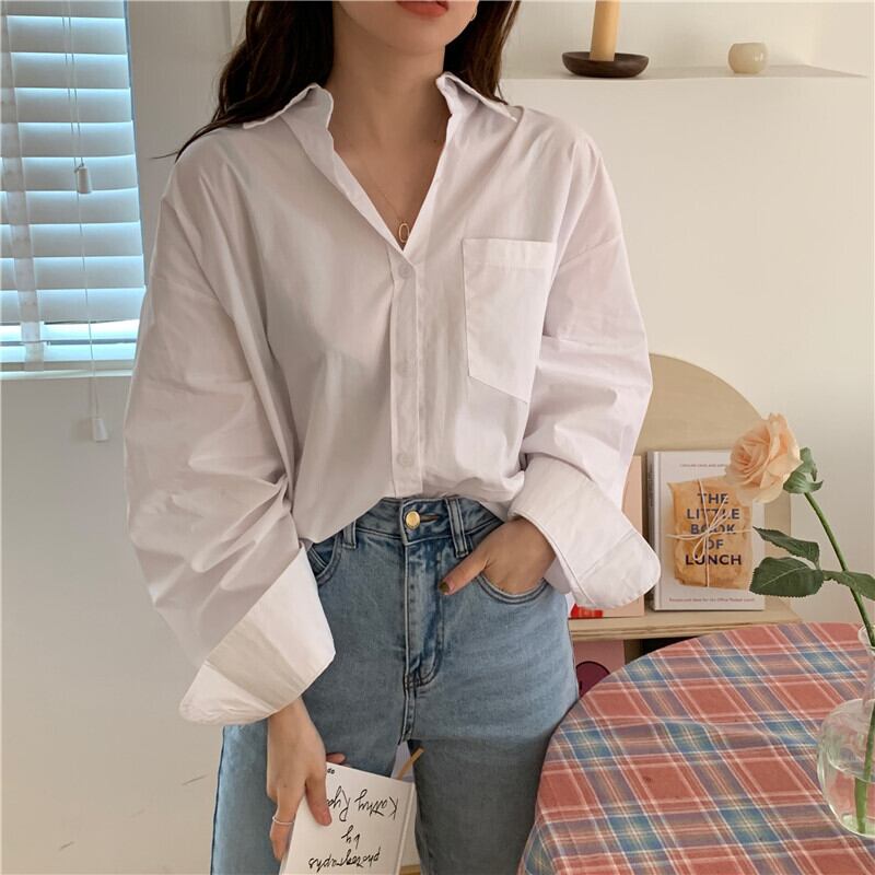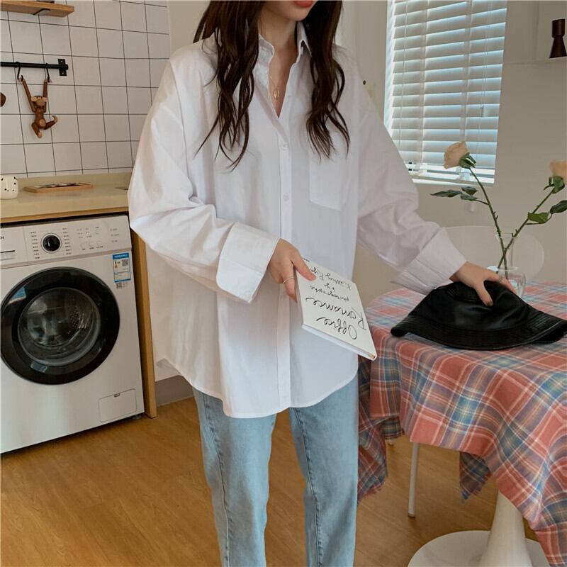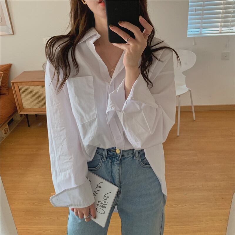 insトレンディな白いシャツの女性のbfスタイル2020春の緩いバージョンの新しい怠惰なスタイルの学生長袖シャツの女性 クレセントシティ4410208968