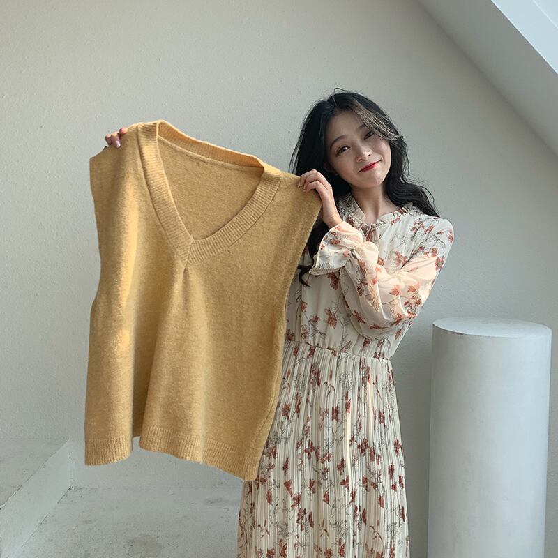 シフォンフローラルスカート女性秋2020新しいウエストプリーツ気質フレンチドレス+カーディガンVネックニットベスト クレセントシティ53094449767