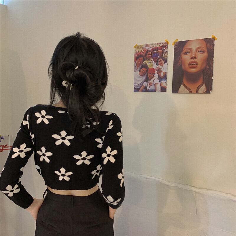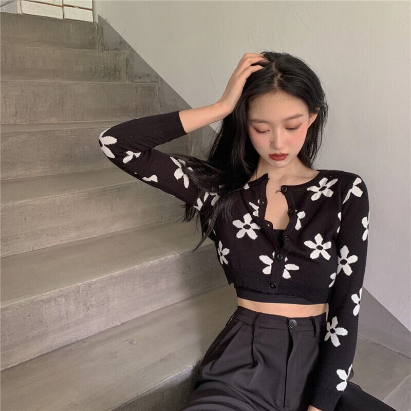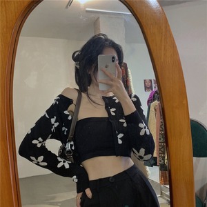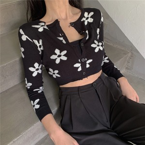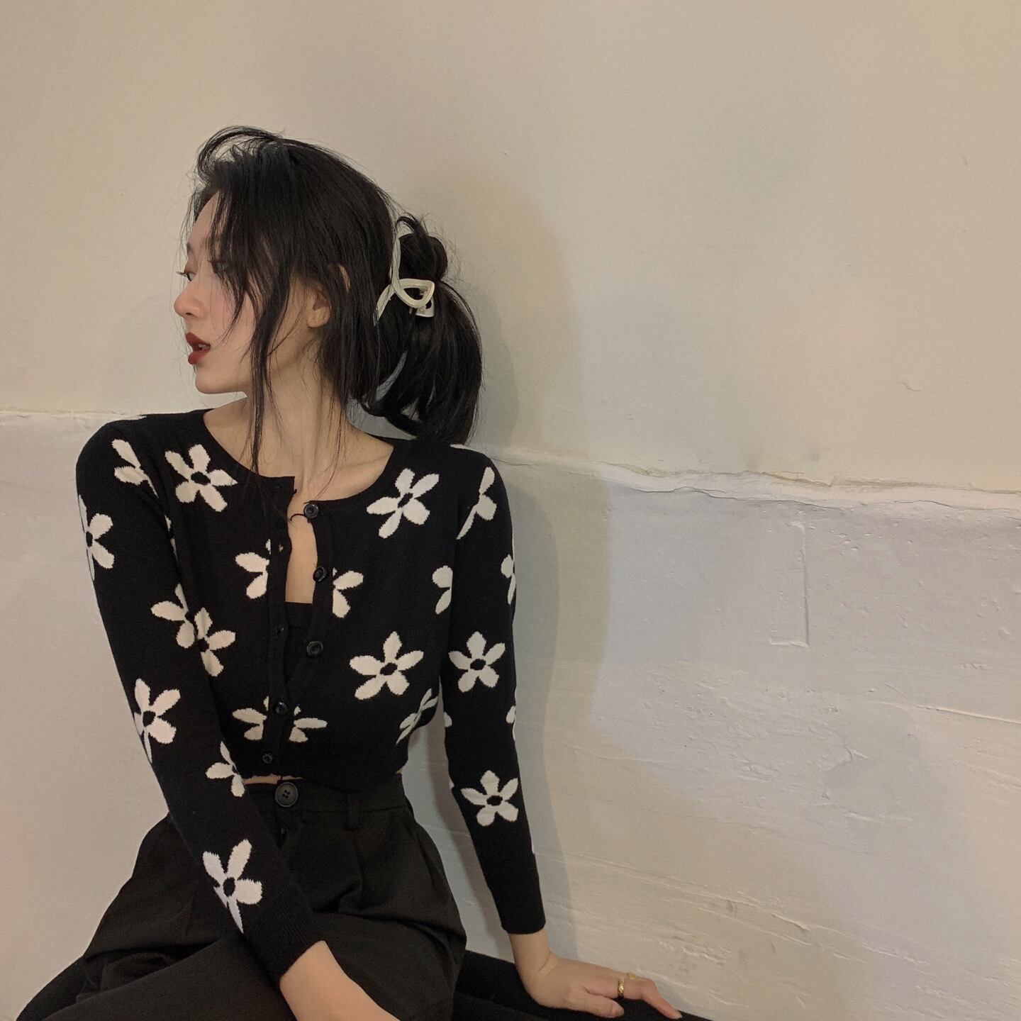 ジャカードブラックニットスモールカーディガンレディース秋長袖ジャケット2020新作スリムショートクロップトップセーター クレセントシティ54811889348