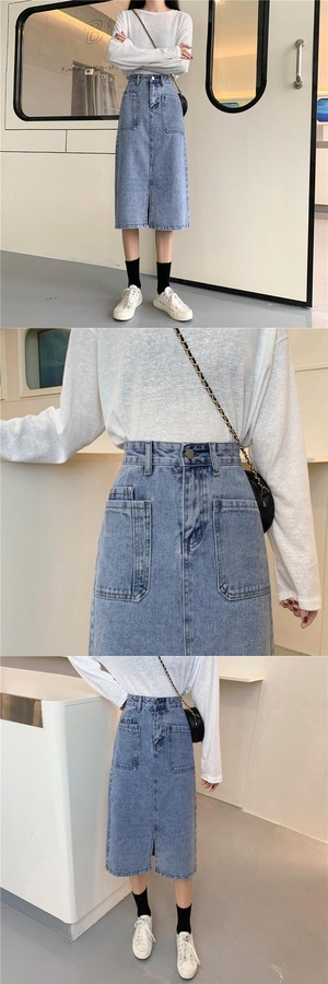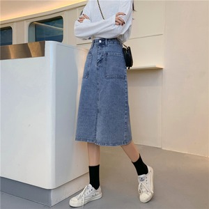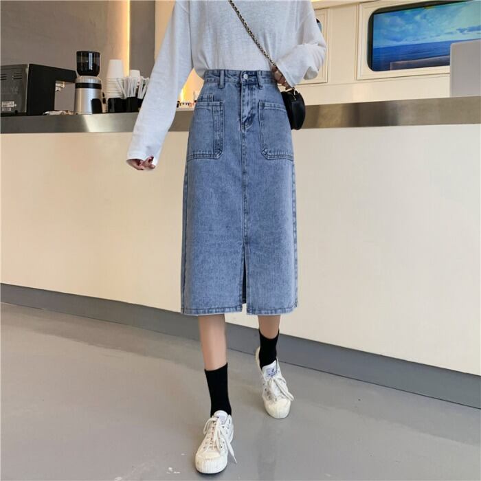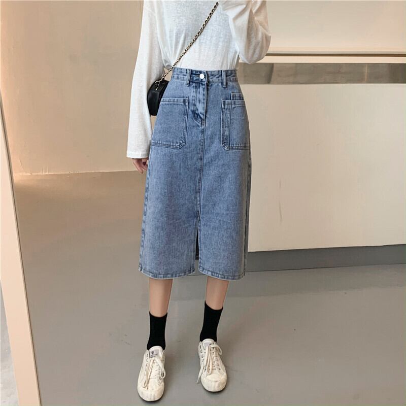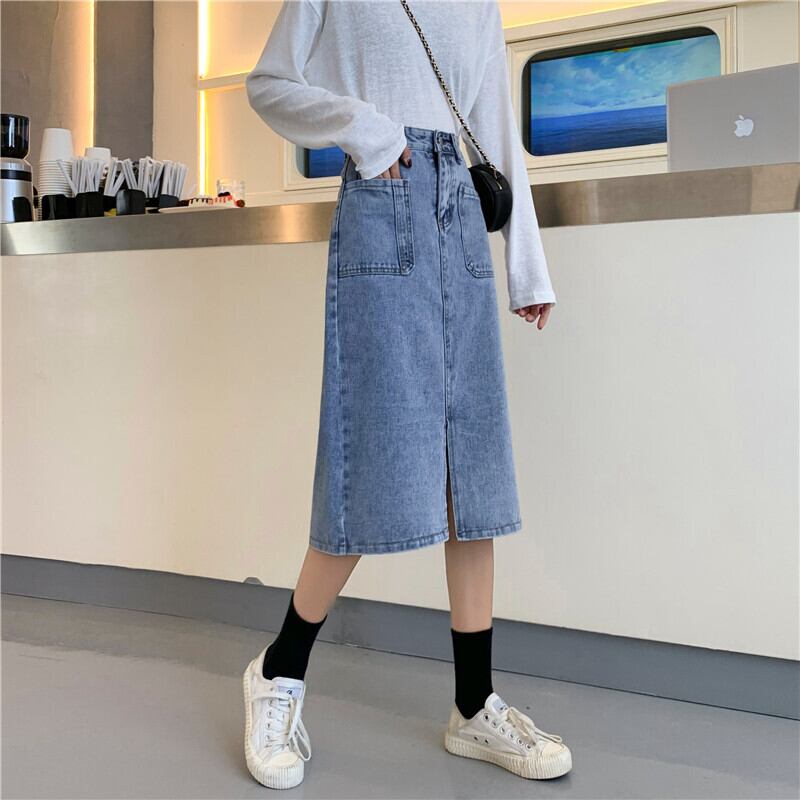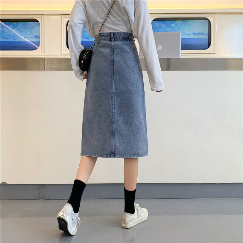 淡い色のハイウエストデニムスカートレディース2020年初秋レディース新作ミッドレングススリムAライン分割スカート クレセントシティ71125049323