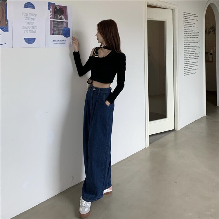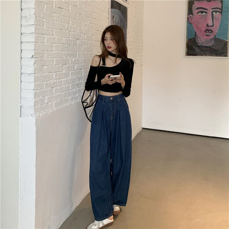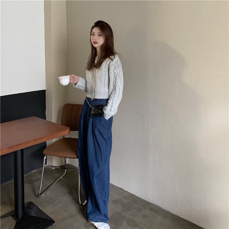 レトロなブルーのハイウエストジーンズ女性の2020年初秋の新しい緩い、薄いバージョンの小さなワイドレッグモップパンツトレンド クレセントシティ56101824847