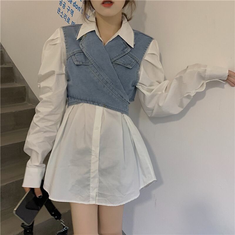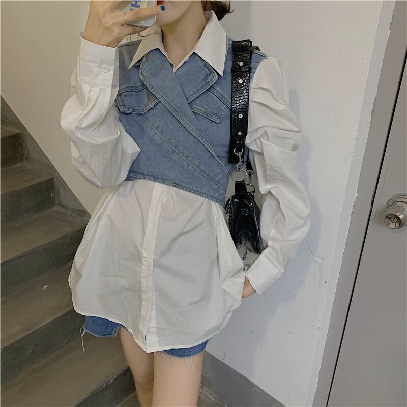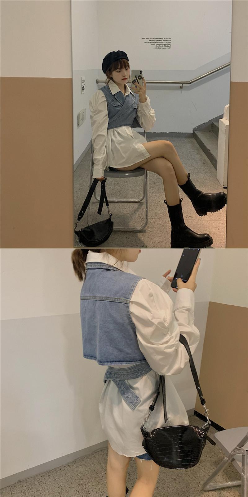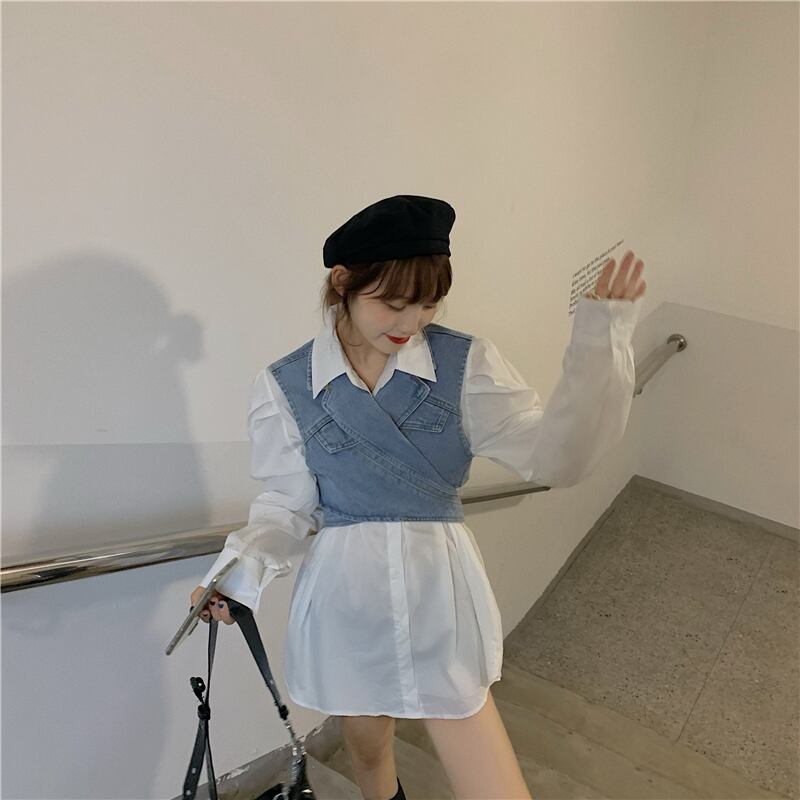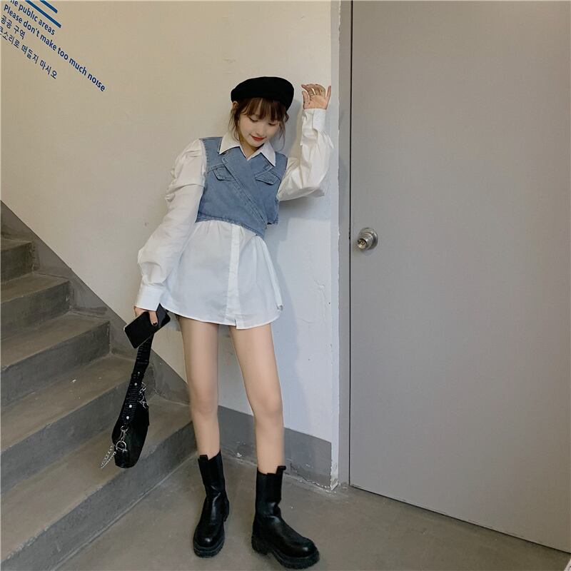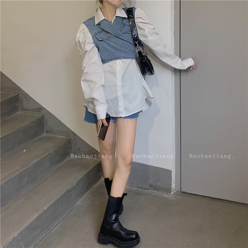 スーツの女性2020年初秋の新しいスタイルのデザインショートデニムベスト+白のルーズシャツスカート クレセントシティ46094926153