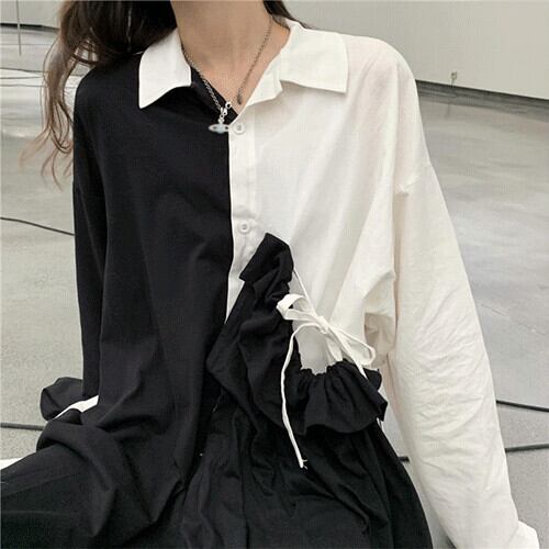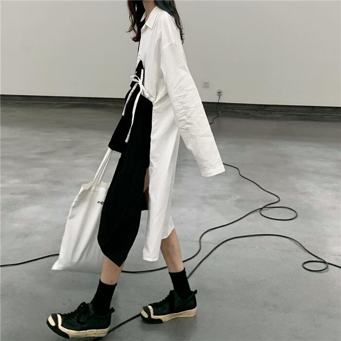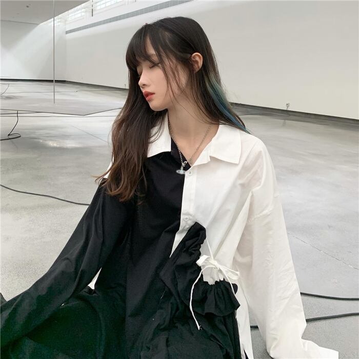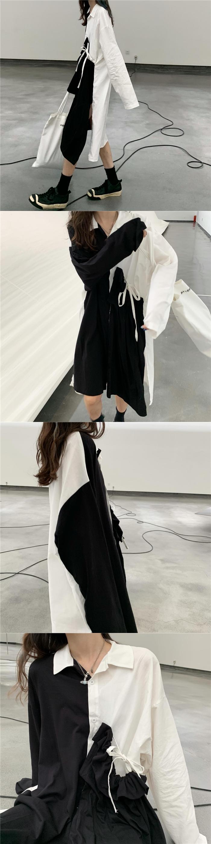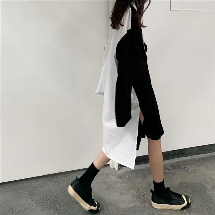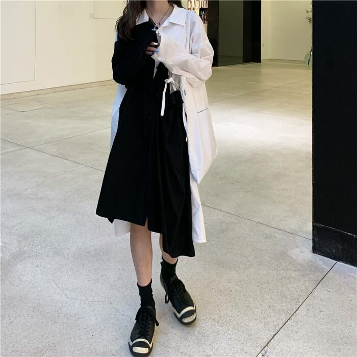 黒と白のカラーマッチングの不規則なシャツのスカートのデザインセンス2020年秋新しいルーズ長袖ドレスの女性 クレセントシティ72186348375