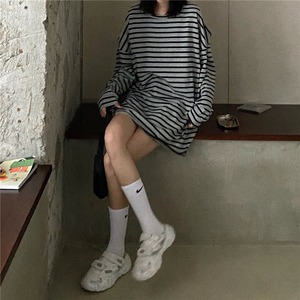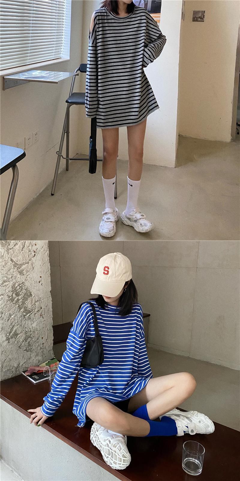 ストライプの長袖Tシャツ女子学生ルーズで薄いラウンドネック2020年初秋新しいストラップレスデザインセンストップ クレセントシティ78689887091