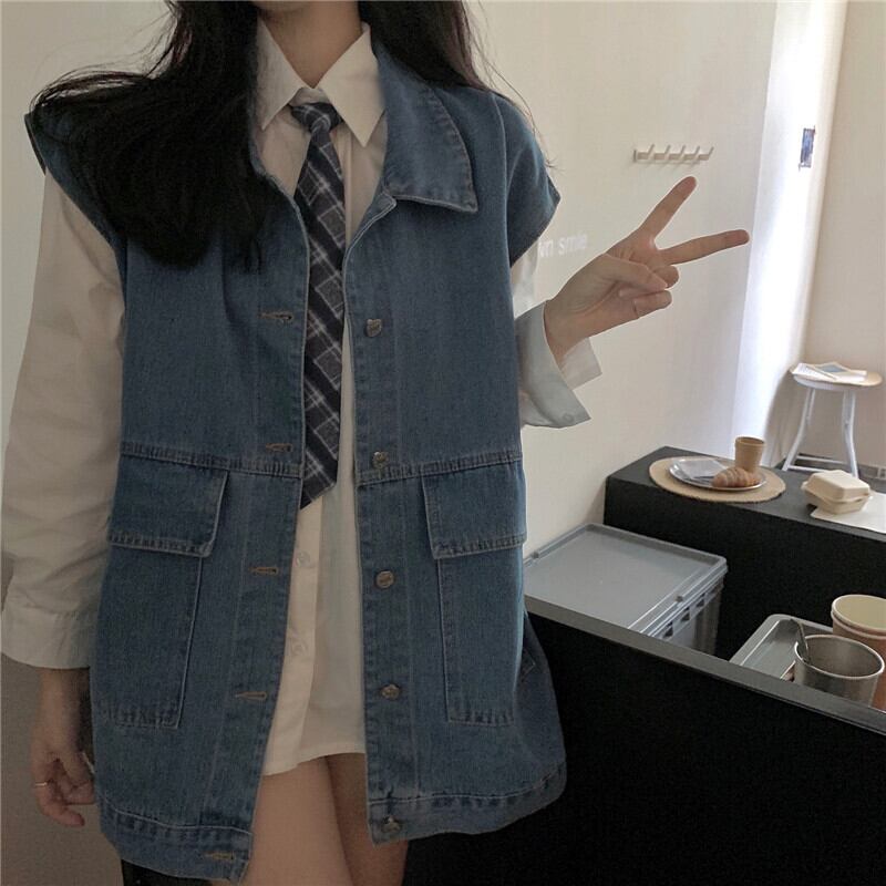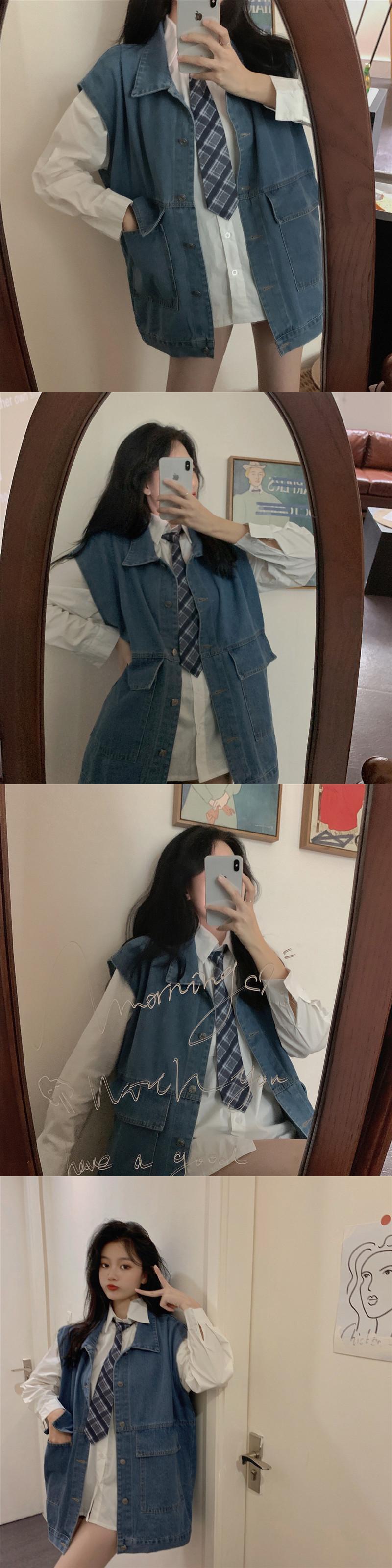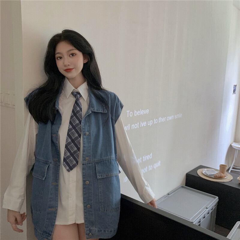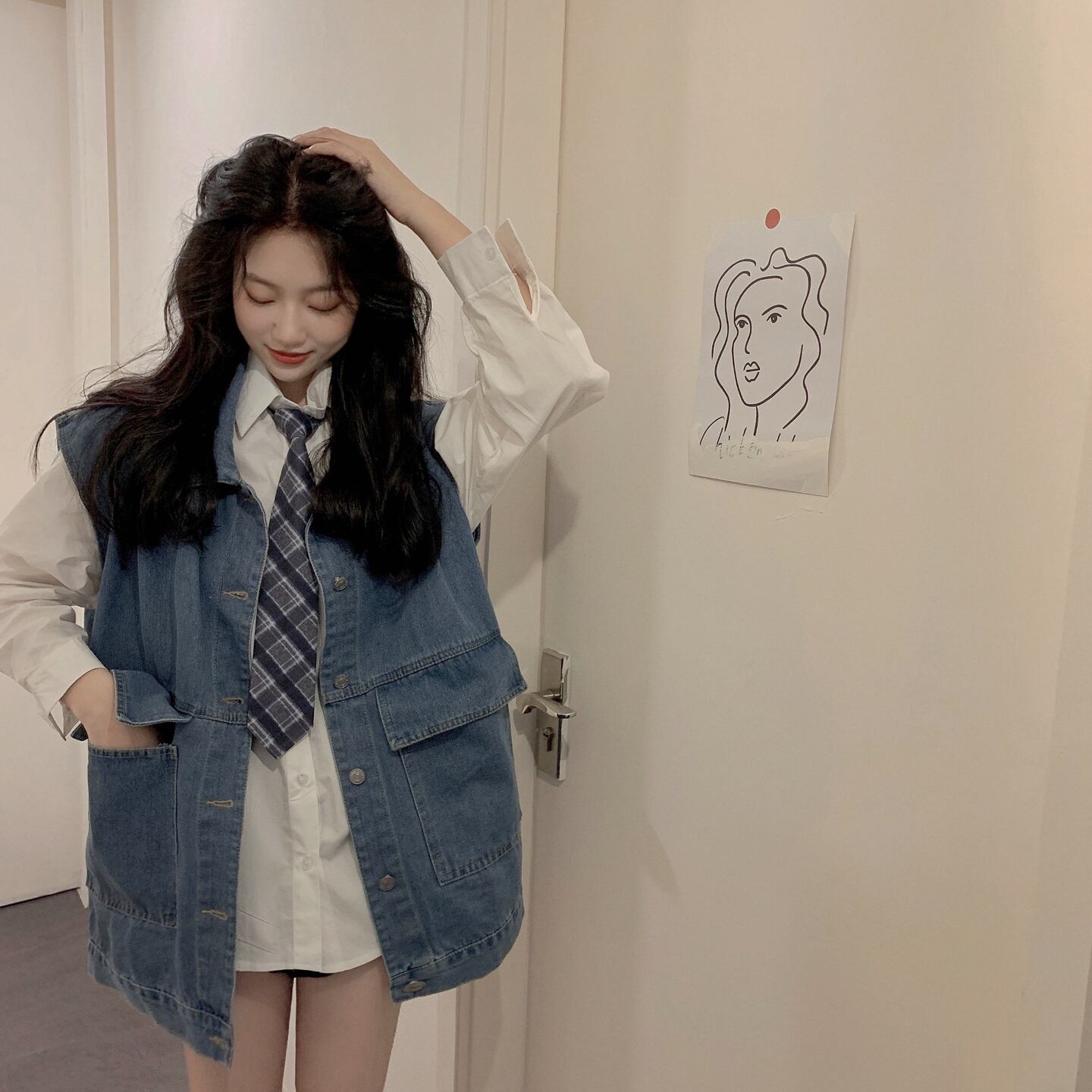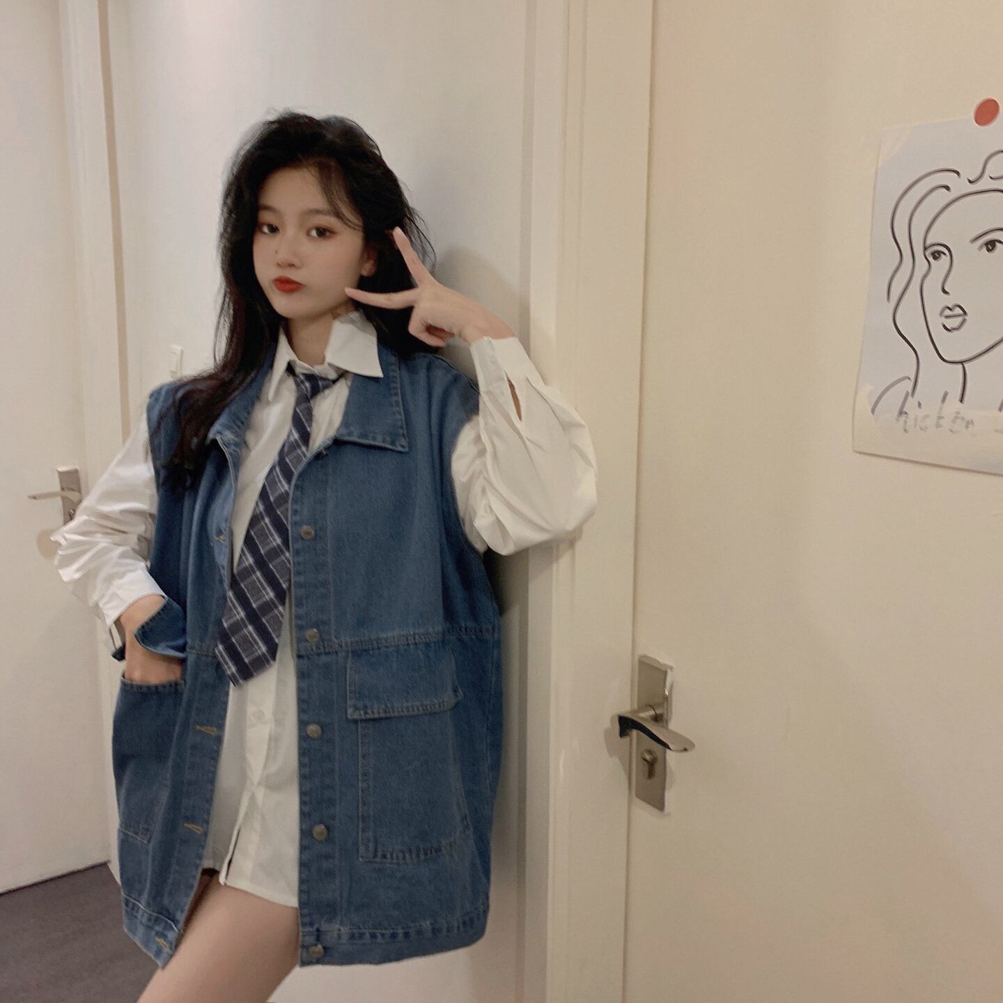 スーツ女性の2020年初秋新しいルーズ長袖ネクタイシャツ+レトロな薄いデニムベスト クレセントシティ59286307960