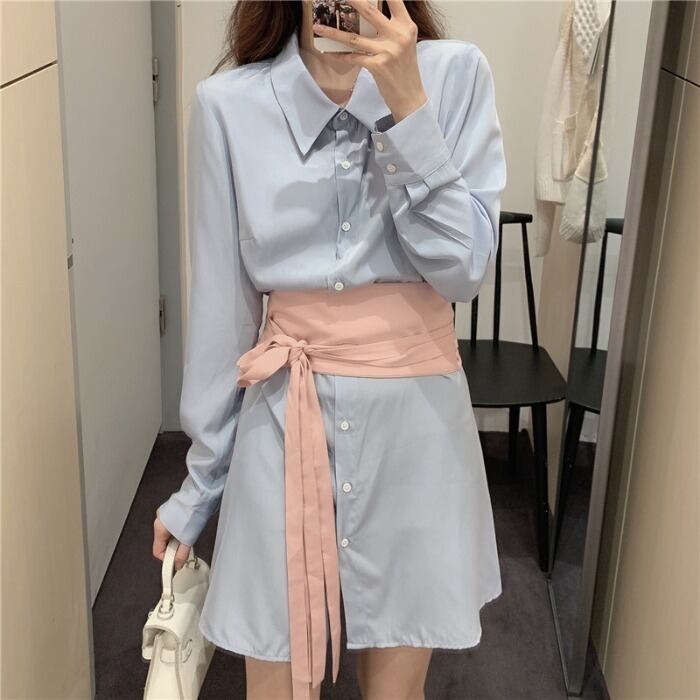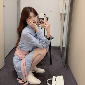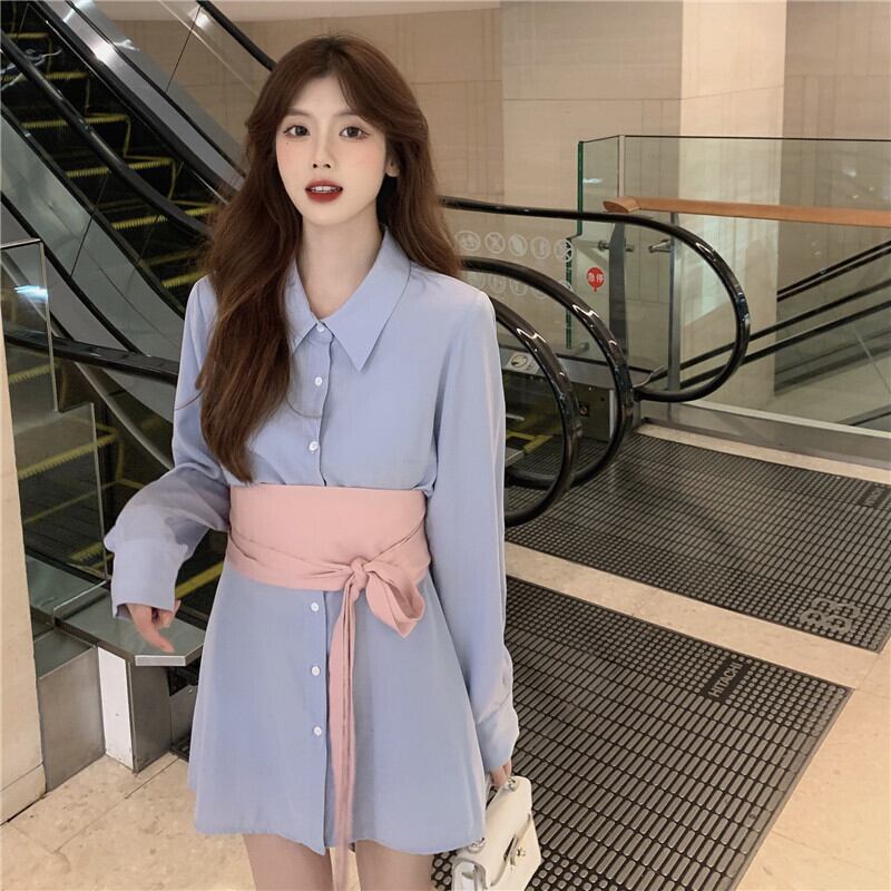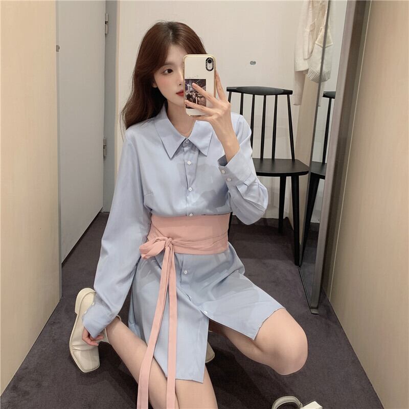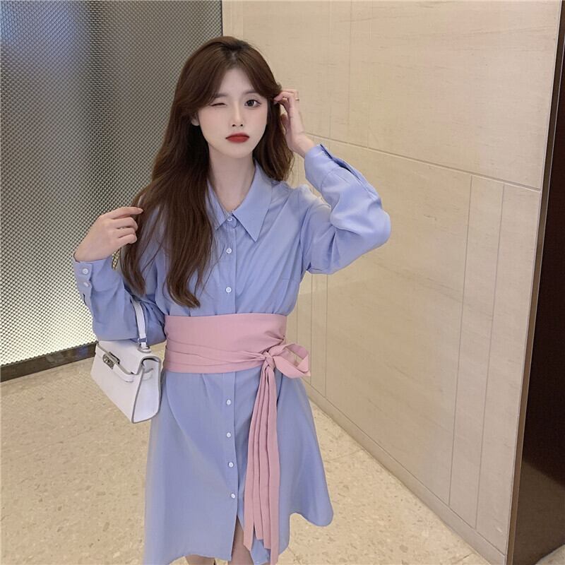 ブルーシャツスカートレディース2020年初秋新作ゆったりミドル丈薄手ワンピース+レースウエストシールイン クレセントシティ50703745274