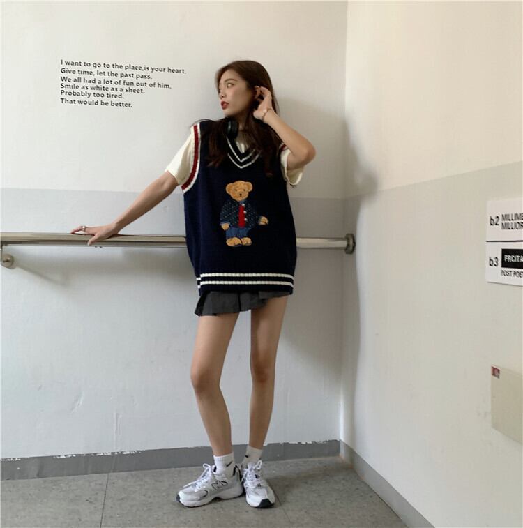 セーターウィメンズ2020年初秋ルーズプルオーバートップ+刺繡ベアニットVネックベストベスト クレセントシティ65966650222