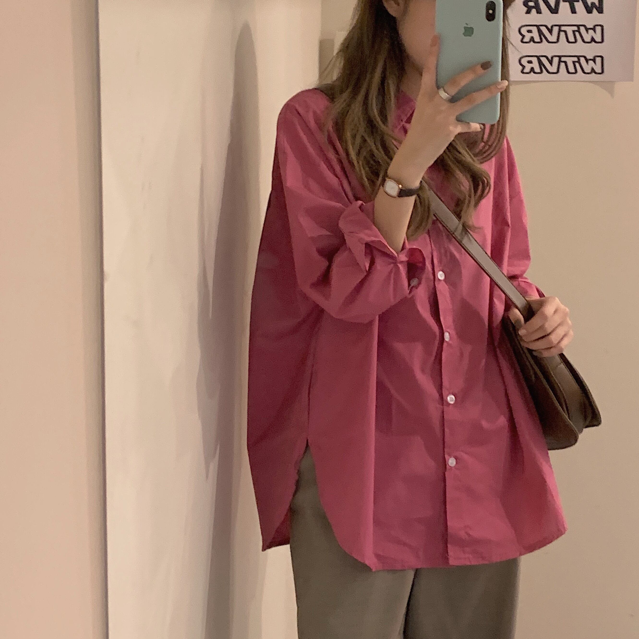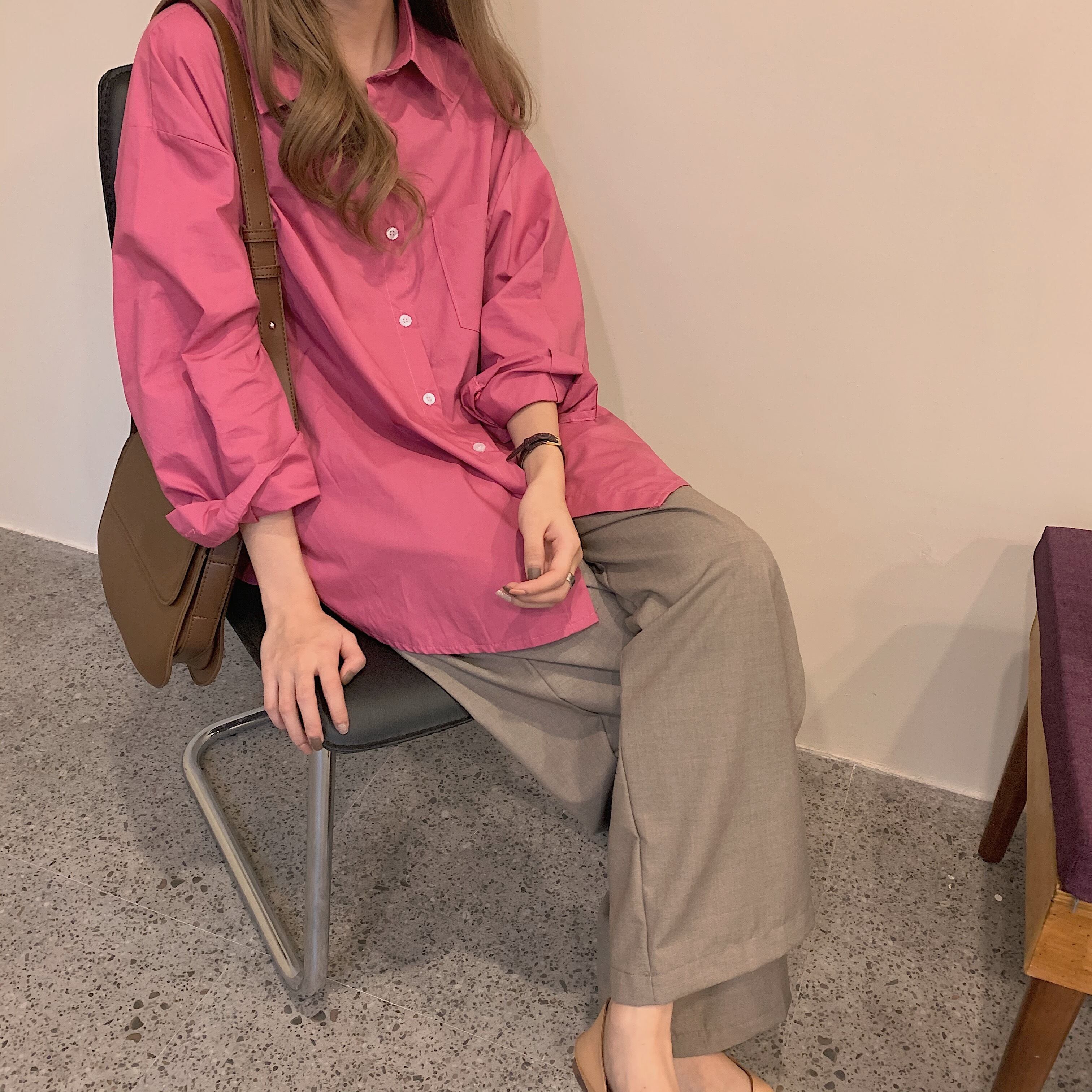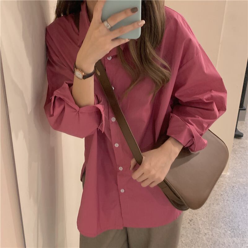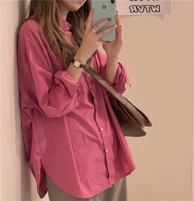 ローズピンクシャツ女性デザインセンスニッチ2020年初秋新作ルーズミドル丈カジュアル長袖シャツ クレセントシティ7478231605