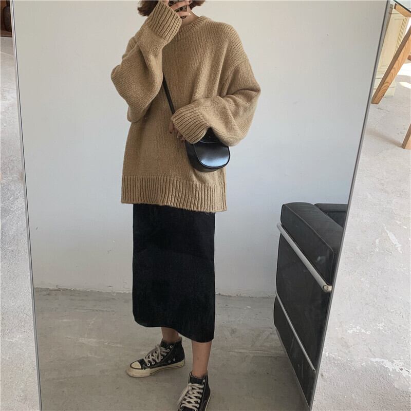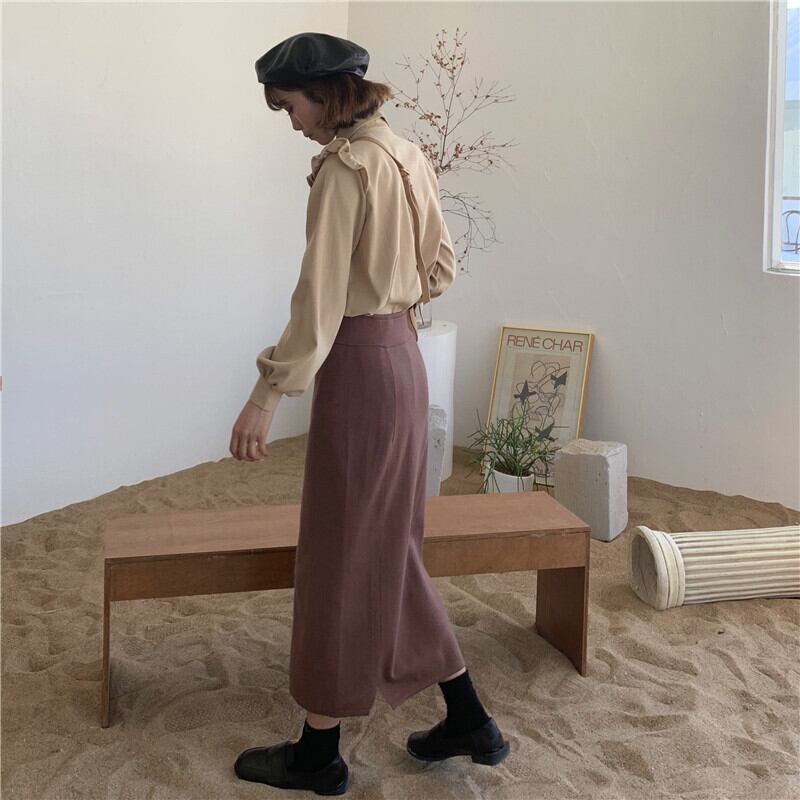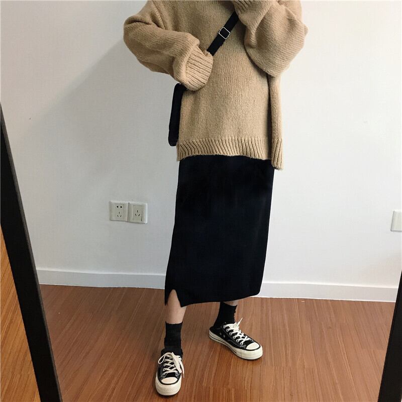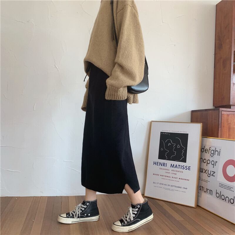 ニットスカート女性デザイン感覚初秋2020新しい弾性ウエストスタイルハイウエスト分割Aラインミドル丈スカート クレセントシティ24234996234