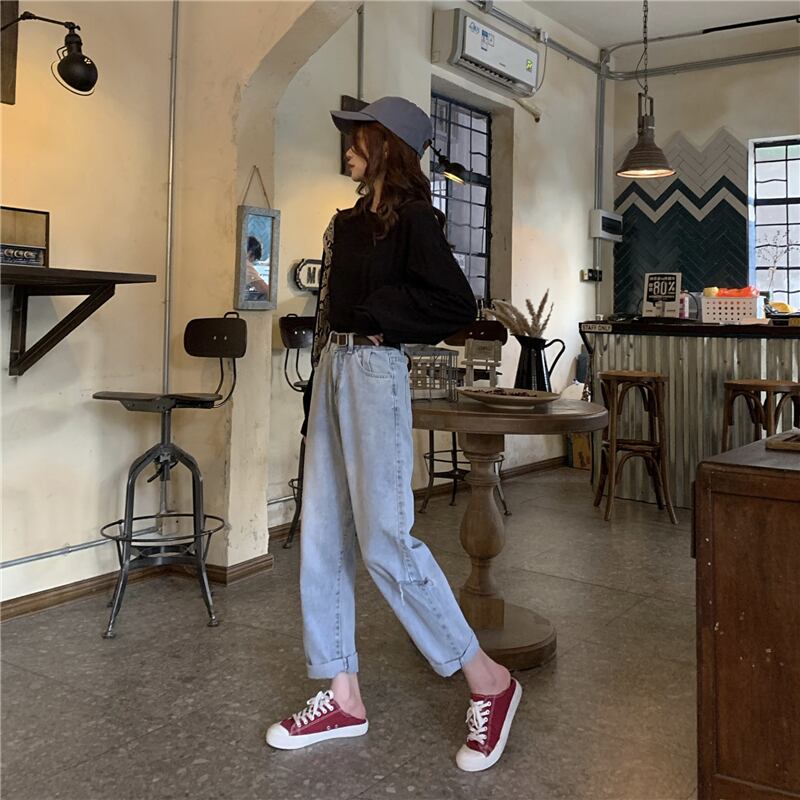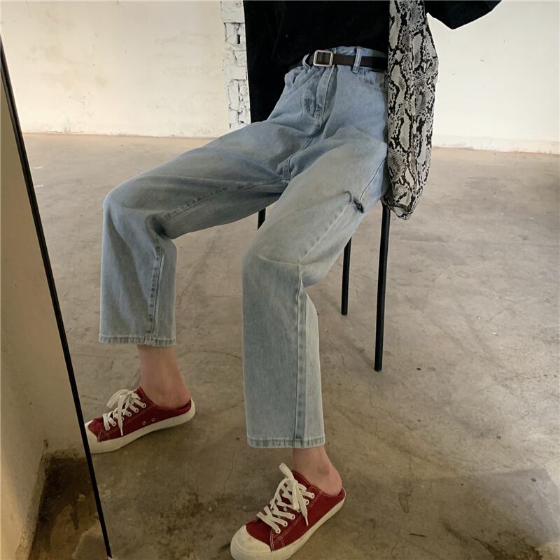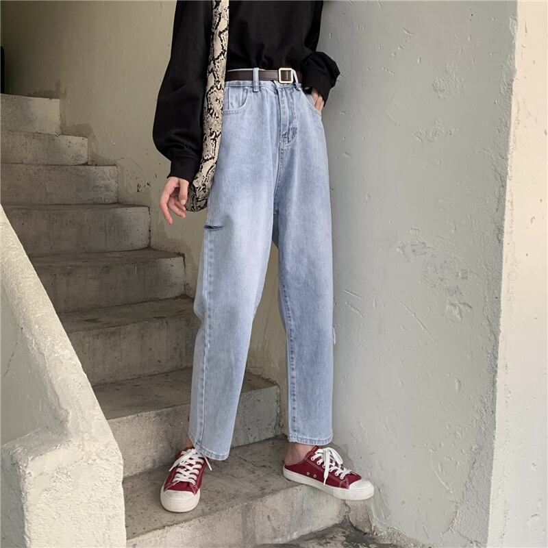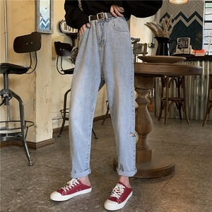 明るい色のジーンズの女性の2020年初秋新しいレトロな香港風味の小さなハイウエストのスリムで破れたストレート9ポイントパンツ クレセントシティ17814146094