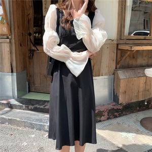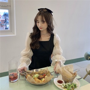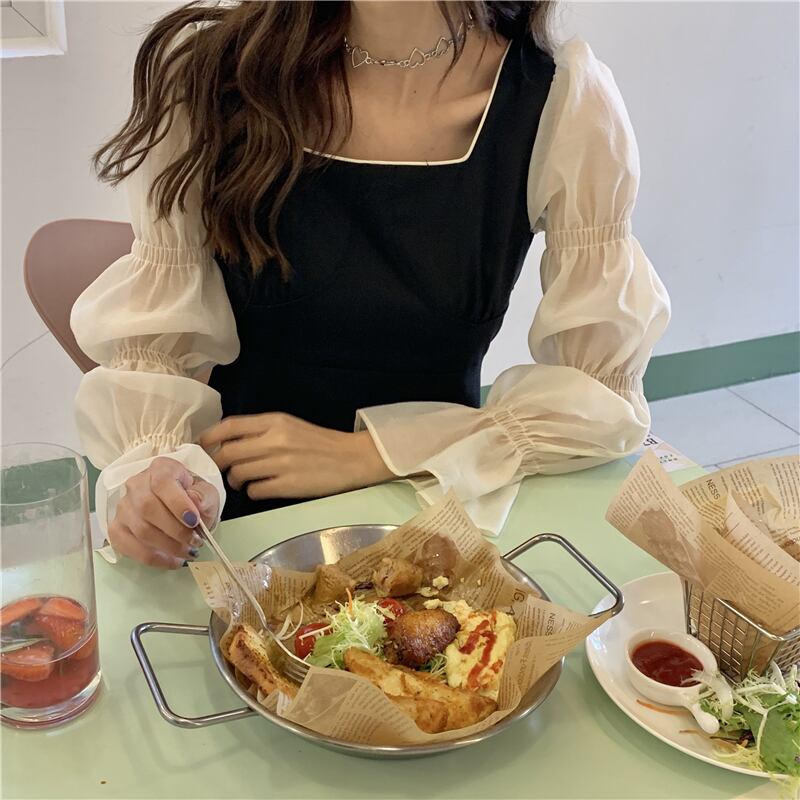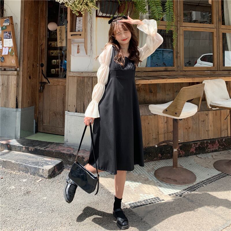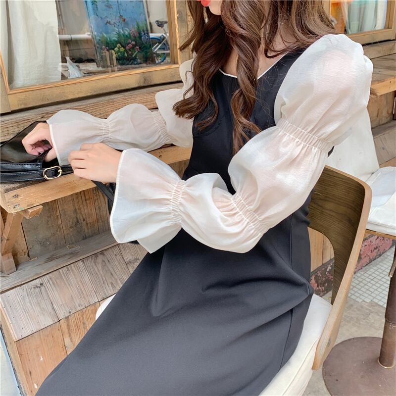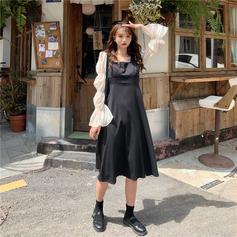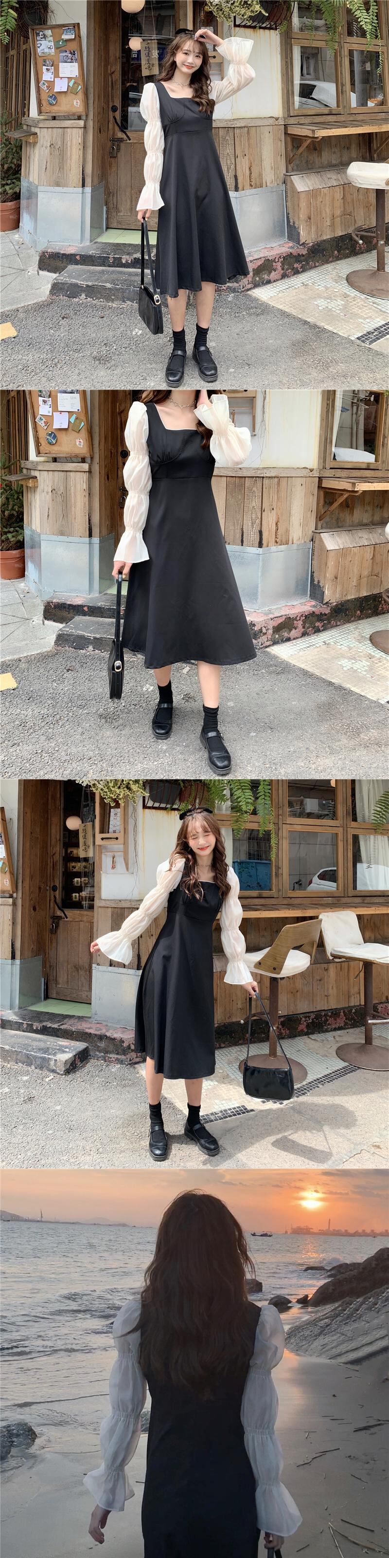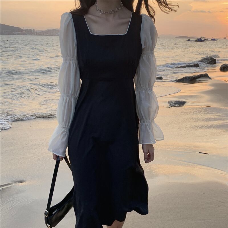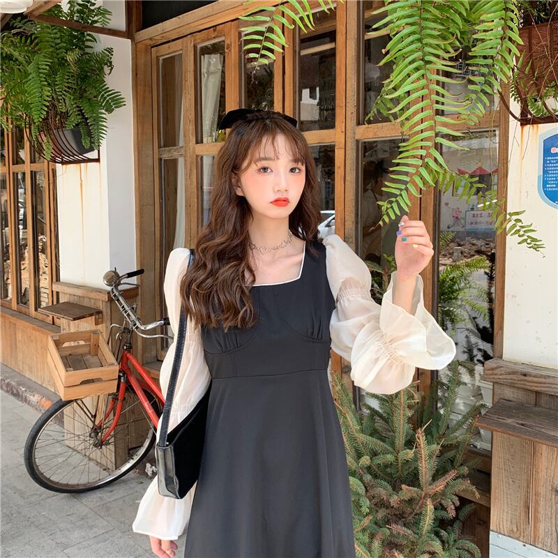 ドレスレディース2020年初秋フランス語気質スクエアカラーシンステッチ袖ウエストAラインリトルブラックドレス クレセントシティ88789451915