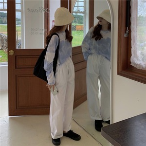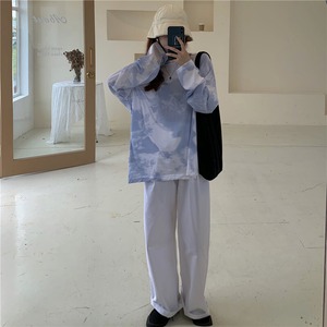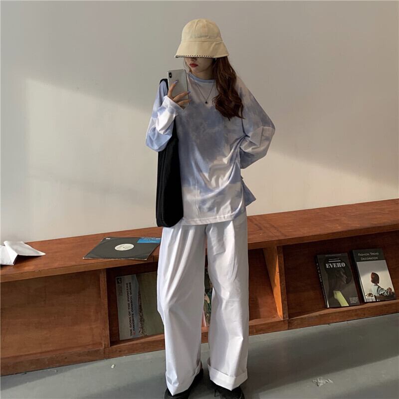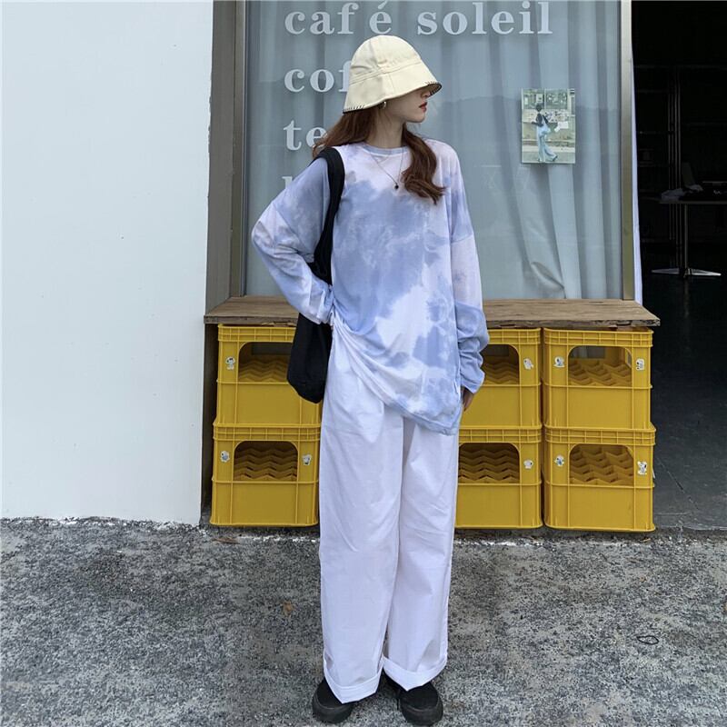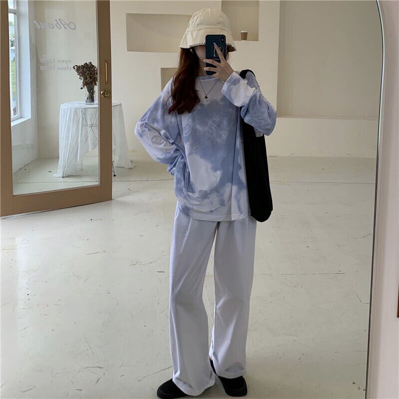 スーツ女性の2020年初秋新しい絞り染めルーズ長袖Tシャツ+伸縮性ウエストワイドレッグパパパンツトレンド クレセントシティ76062767511