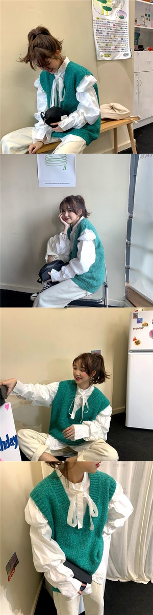 色:シャツ,ピンクのベスト,グリーンベスト