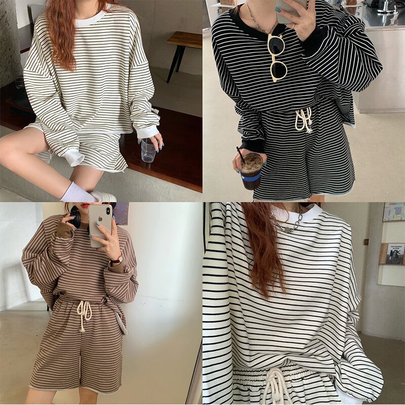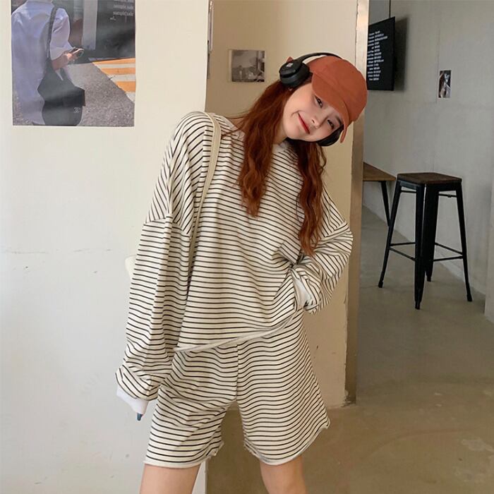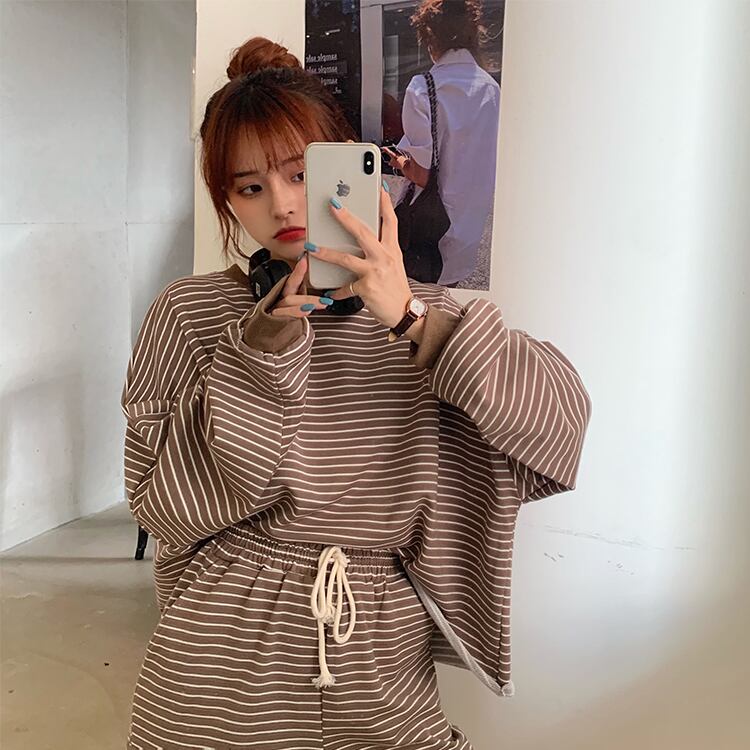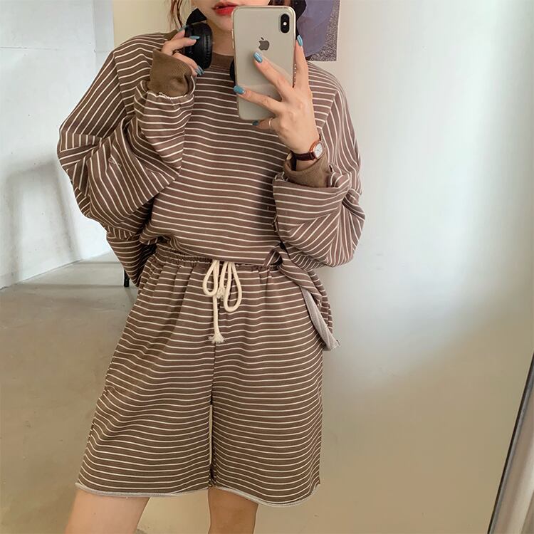 ファッションストライプスーツ女性2020年秋新しいルーズプルオーバーセーター+ハイウエストワイドレッグショーツ クレセントシティ67177267648