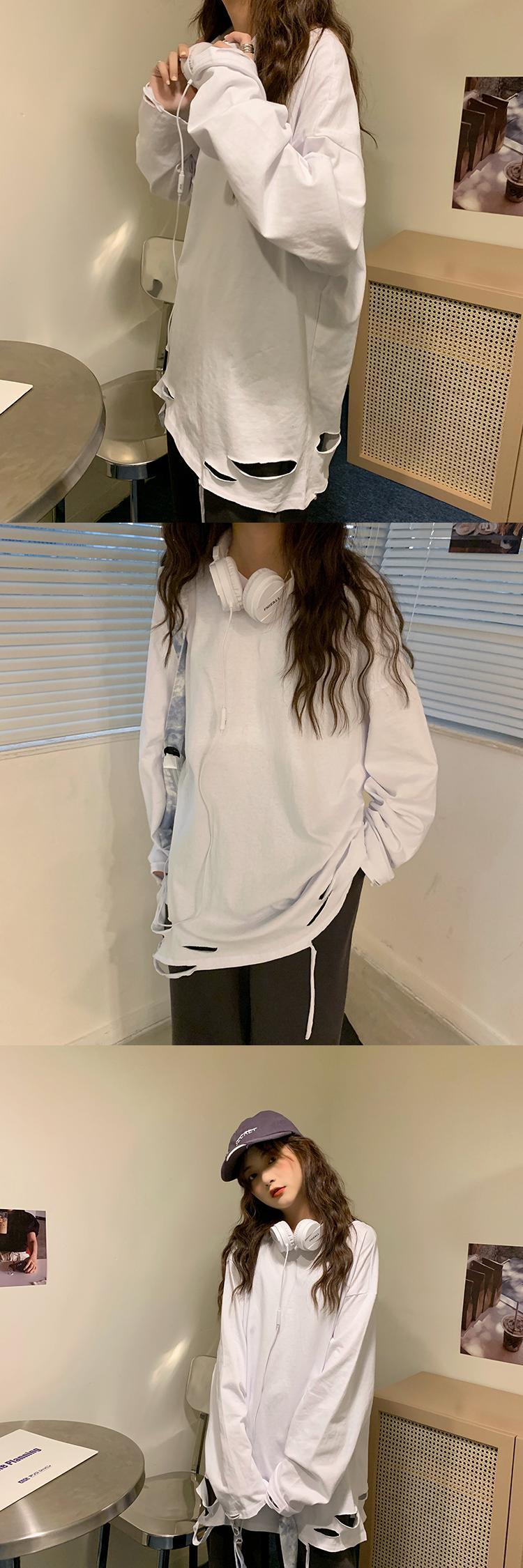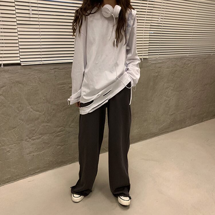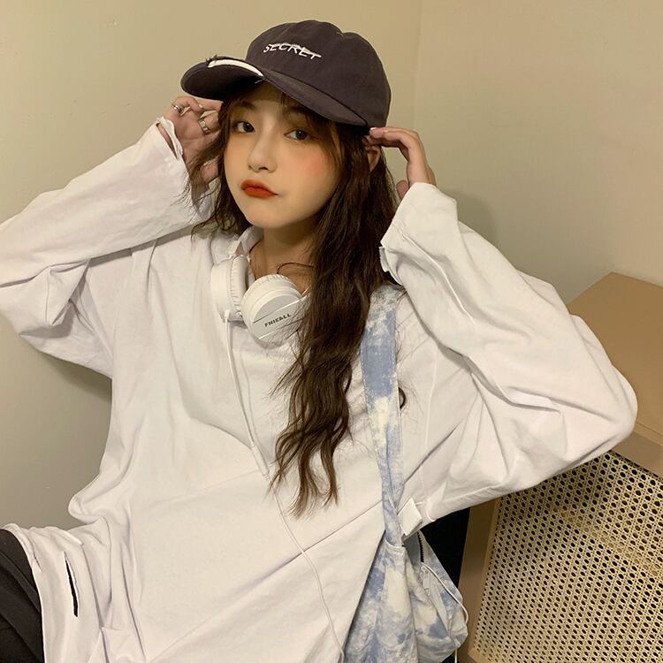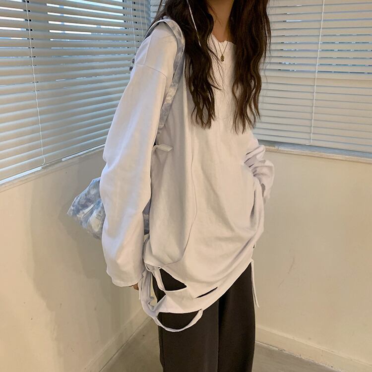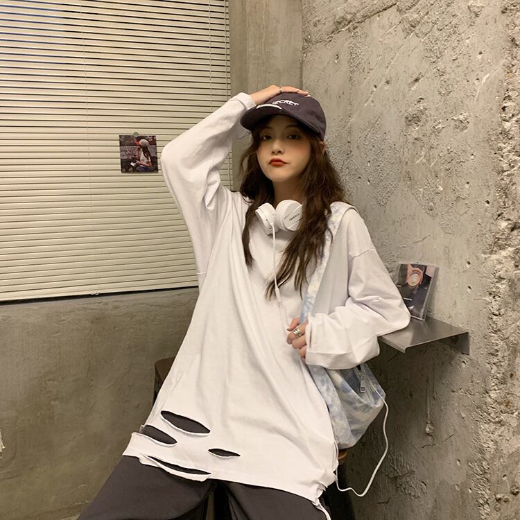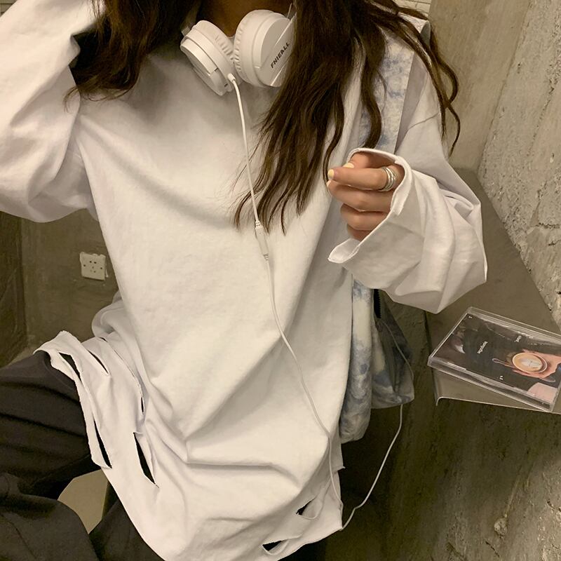 ホワイト長袖Tシャツレディース2020年初秋新作スタイルルーズで怠惰なファッション裾穴ミドル丈トップ クレセントシティ91521167088