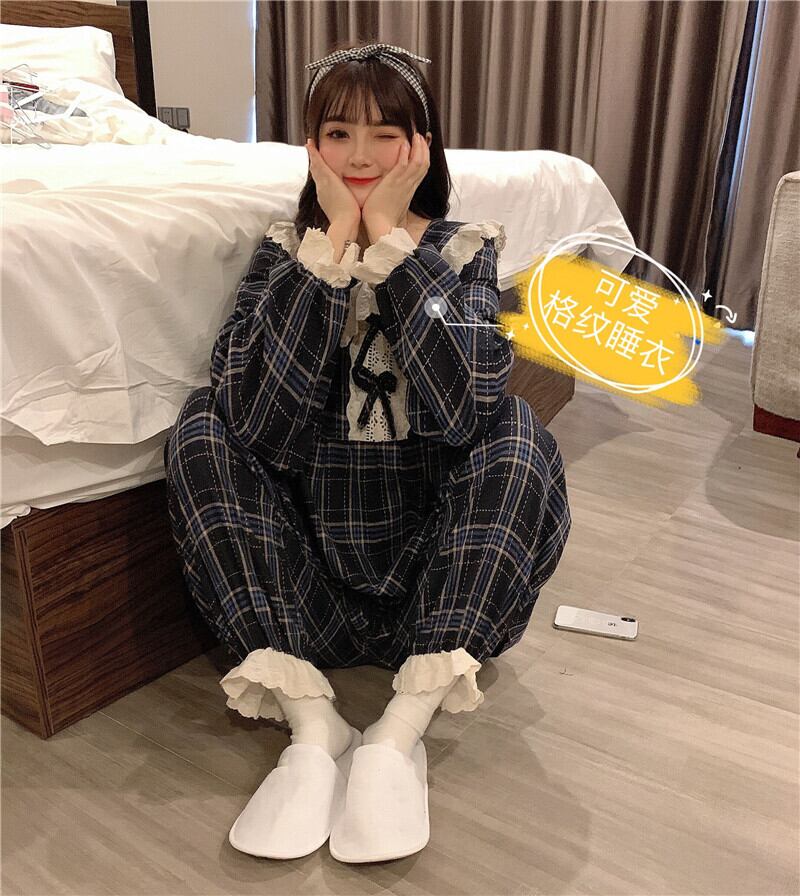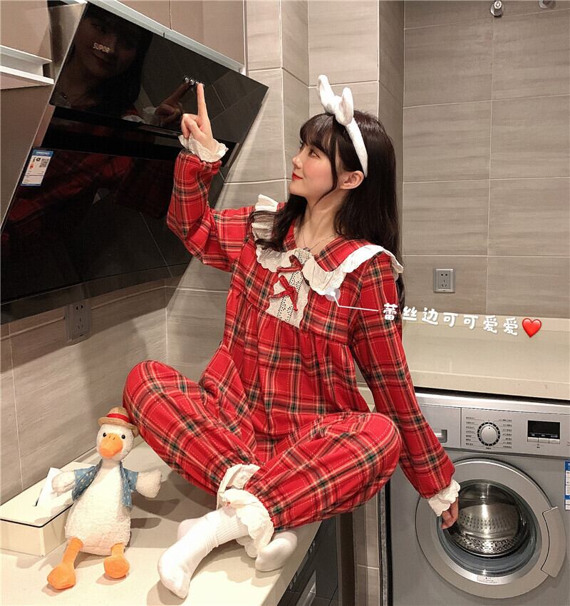 パジャマレディース春秋スーツ長袖パンツチェック柄人形襟レースレーストリムホームサービスかわいいスウィートスーツ クレセントシティ40060665454