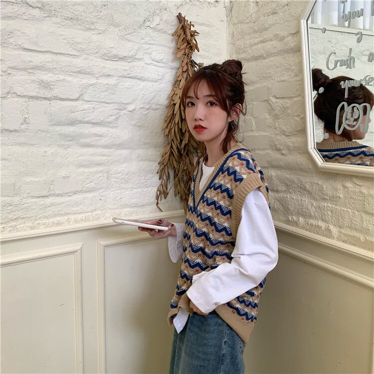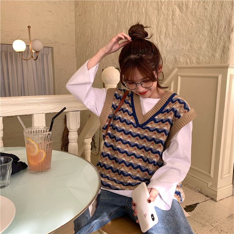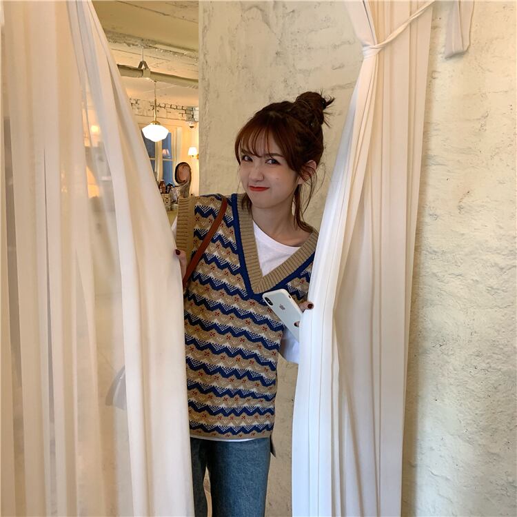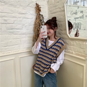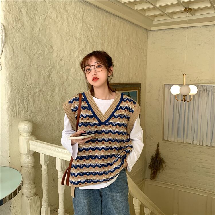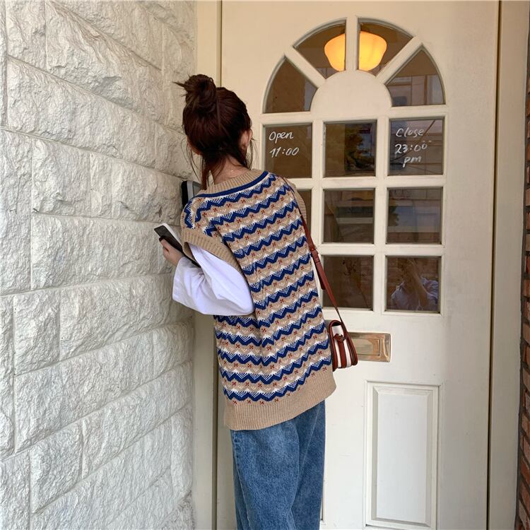 レトロなVネックストライプノースリーブセーターベストレディース秋ニュースタイルルーズスチューデントエインスタイルアウターベスト クレセントシティ54665935111