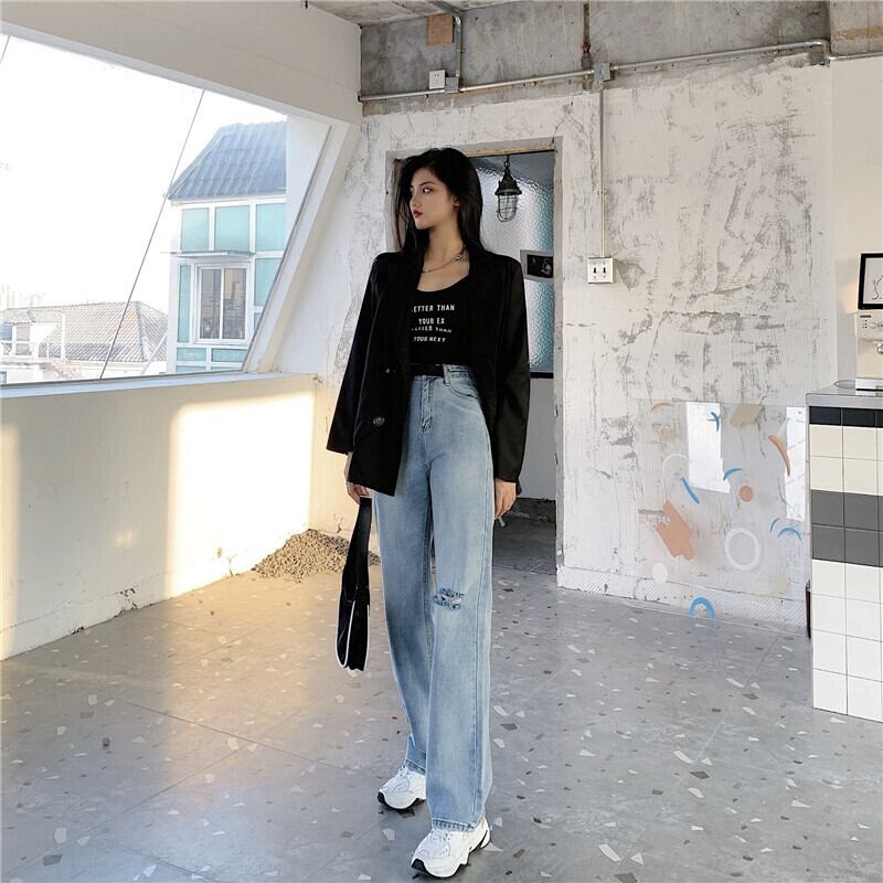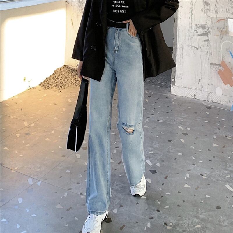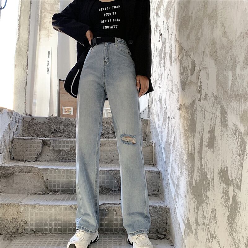淡い色の破れたジーンズ女性の2020年初秋新しいスタイルの調節可能なベルトハイウエストストレートルーズワイドレッグパンツ クレセントシティ22536659720