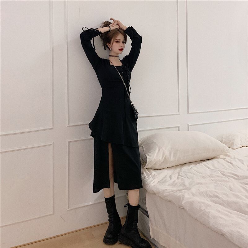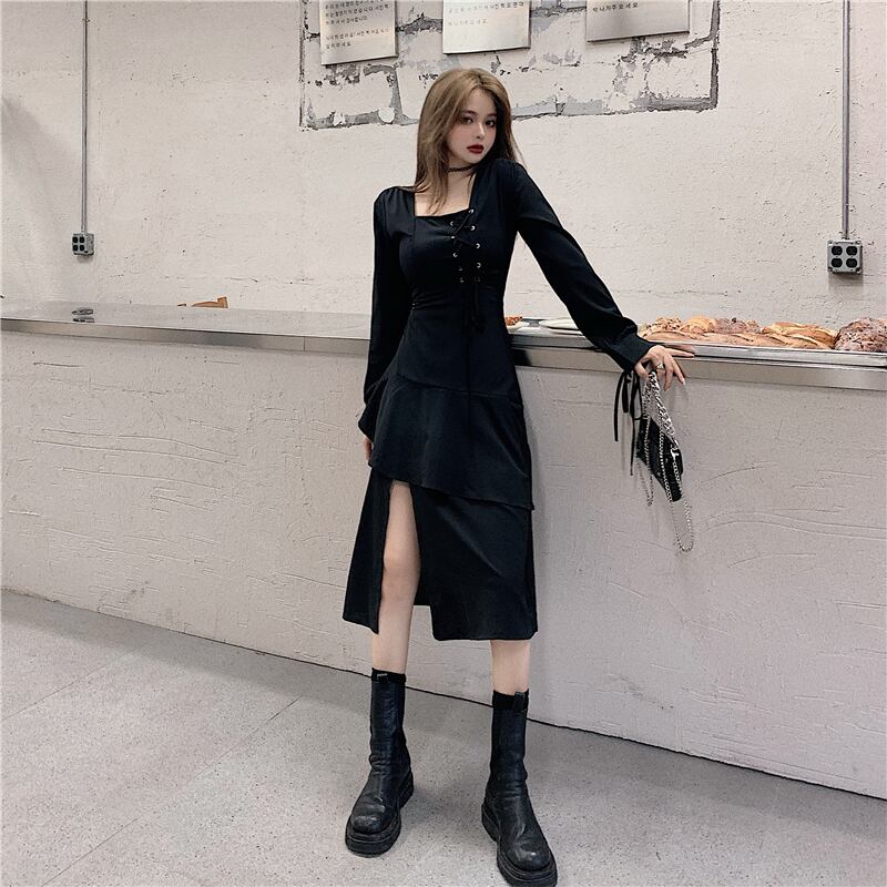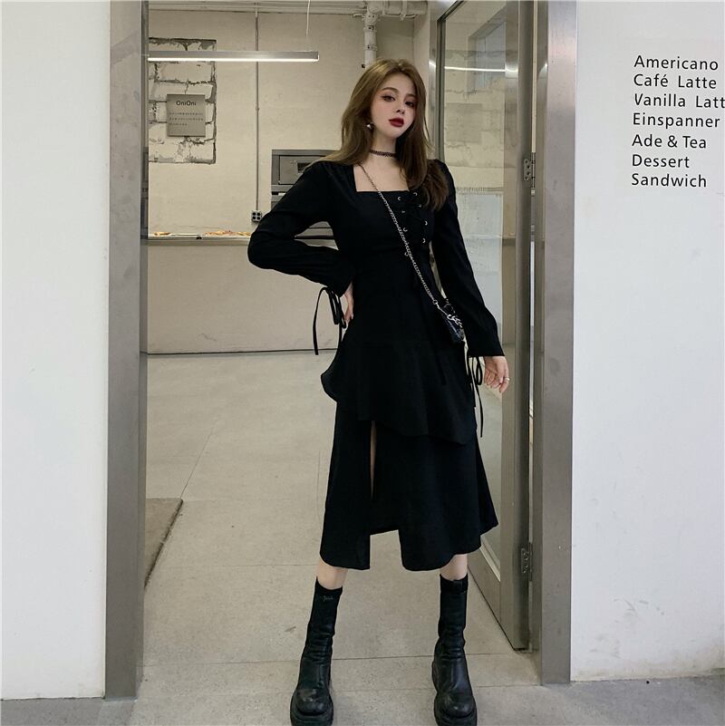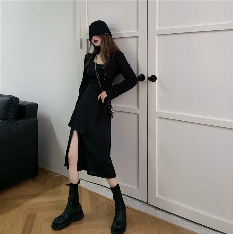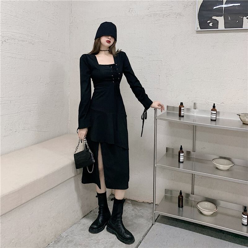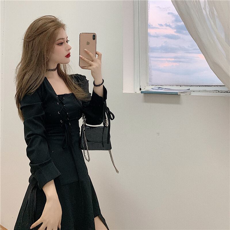 2020年初秋の新しいバージョンのHao Benfengレースアップウエストスリムスモールブラックドレスフレンチニッチスプリットドレス女性 クレセントシティ15209430710