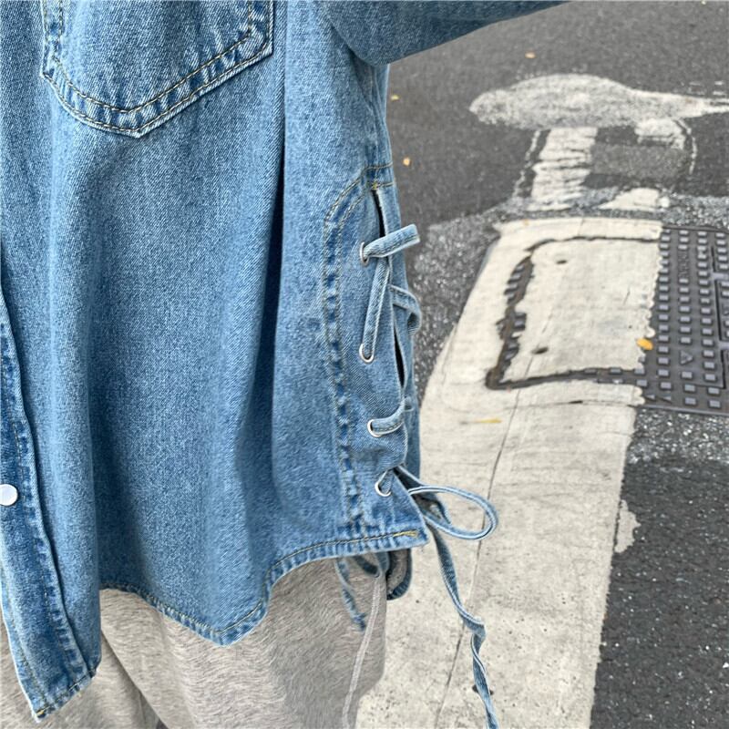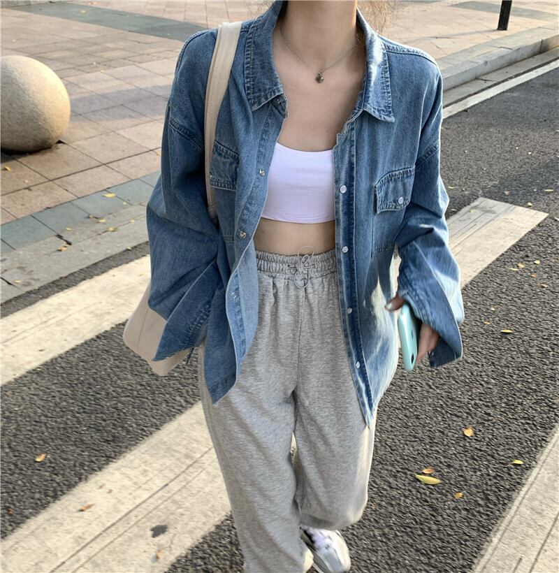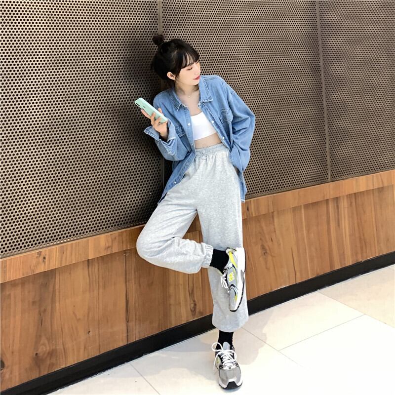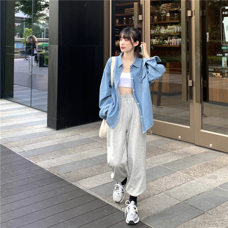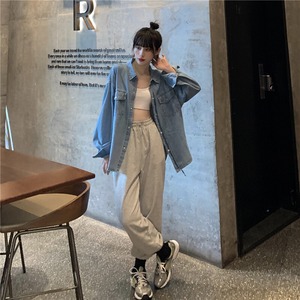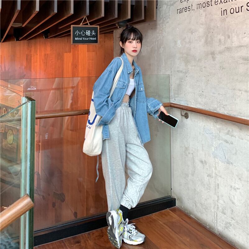 2020年初秋女性のスーツ新しい伸縮性ウエストドローストリングパンツ+ルーズネクタイデニムシャツ クレセントシティ38482553537