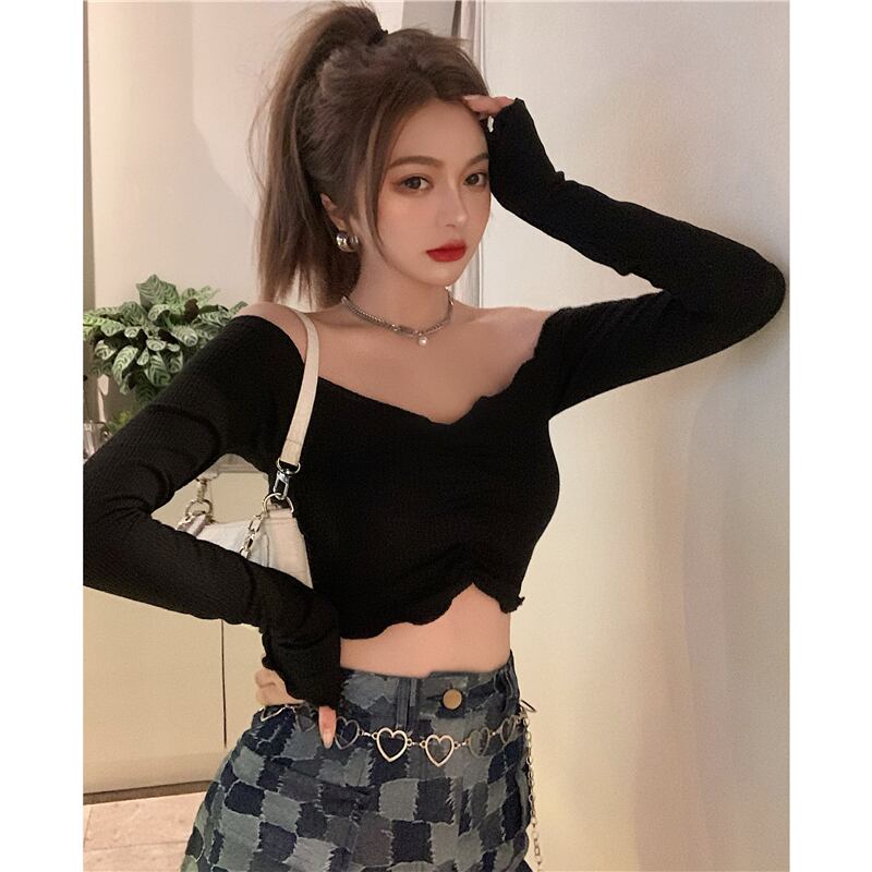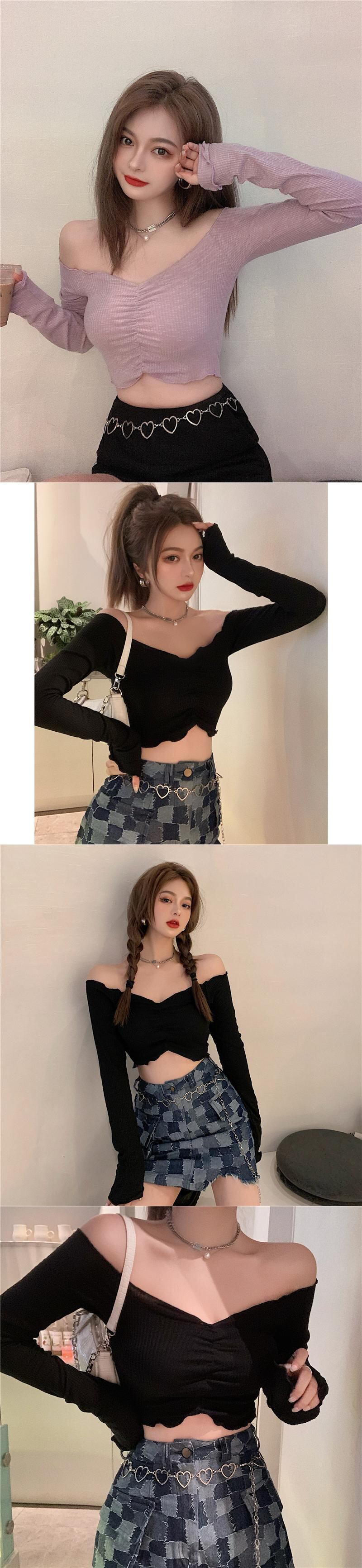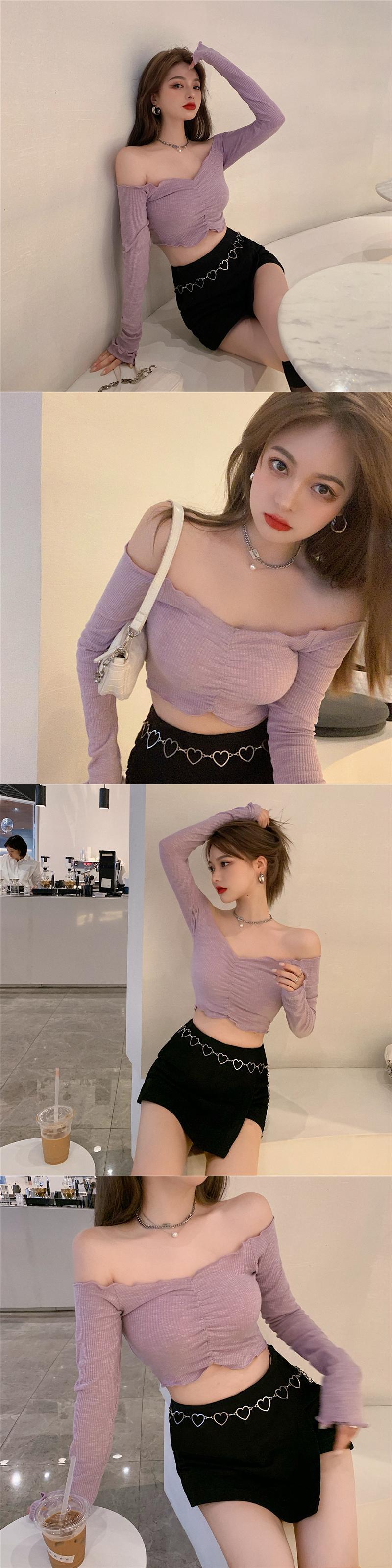 ピュアカラー長袖Tシャツ2020年夏ウィメンズプリーツデザインセンスの新バージョンショルダースリムショートクロップトップ クレセントシティ313979133