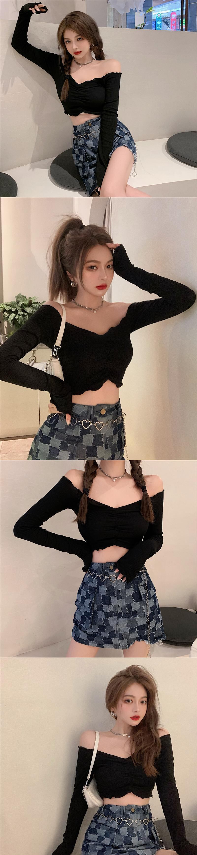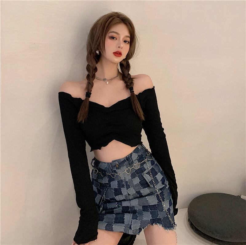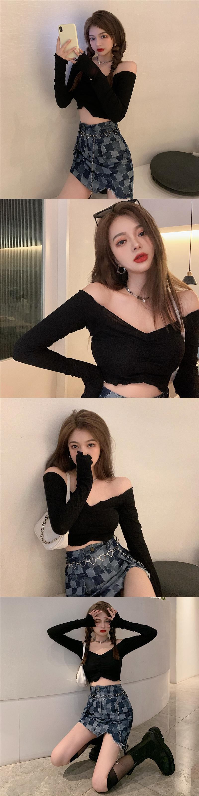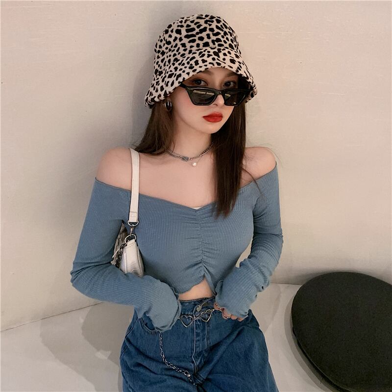 ピュアカラー長袖Tシャツ2020年夏ウィメンズプリーツデザインセンスの新バージョンショルダースリムショートクロップトップ クレセントシティ313979133