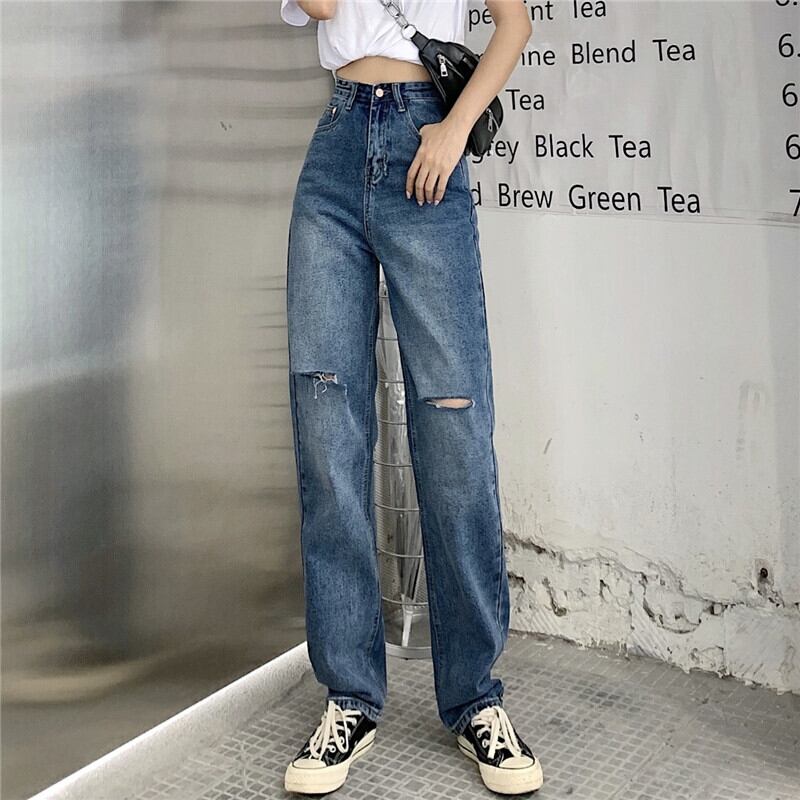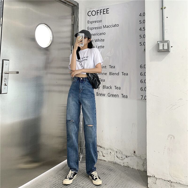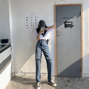 レトロなブルーの破れたジーンズの女性の2020年初秋ハイウエストルーズで薄いドレープストレートワイドレッグパンツの新バージョン クレセントシティ75678946867