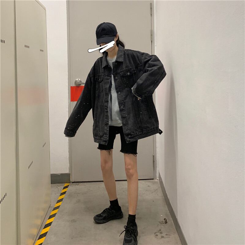 ブラックデニムジャケットレディース2020年初秋新バージョンルーズレイジーキャラクター手描きデザインカジュアルトップス クレセントシティ33453867577