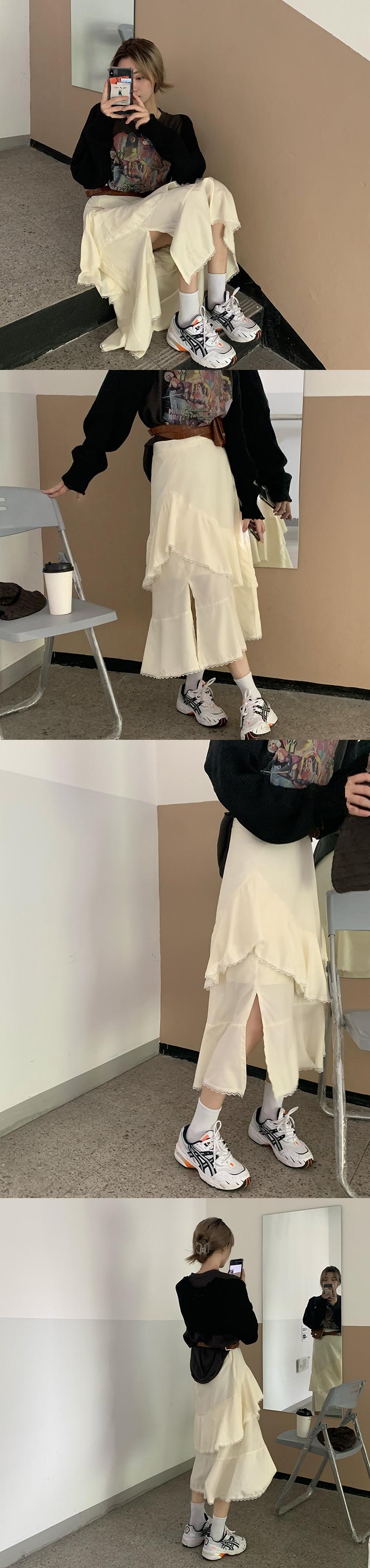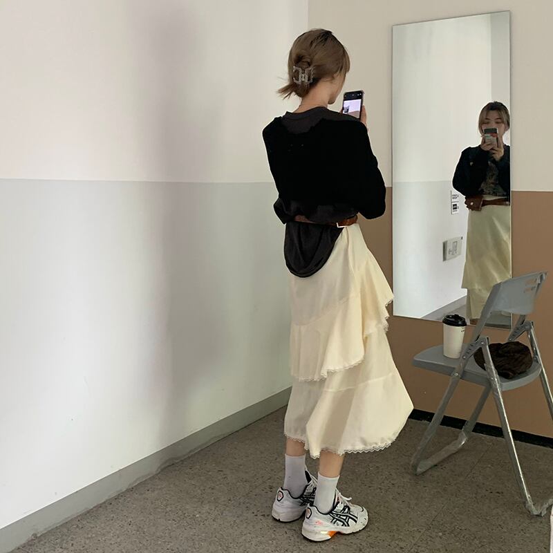 フレンチケーキスカートレディース秋2020新しいハイウエスト痩身レース不規則な分割ミドル丈スカート クレセントシティ99588259660