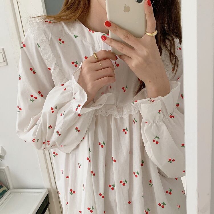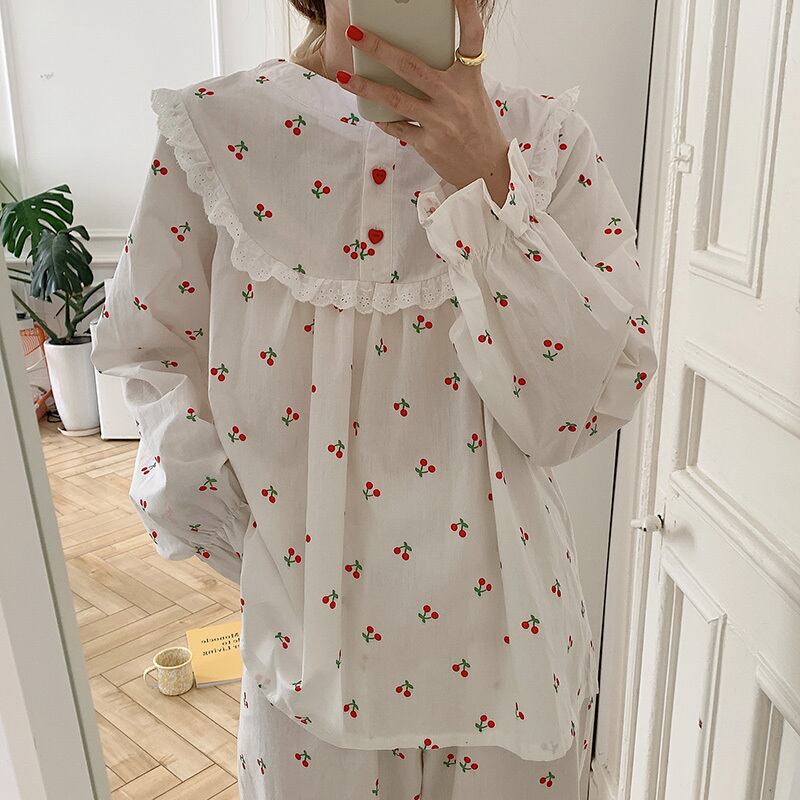 ネグリジェ女性の2020年初秋新バージョンルーズシンセクションスモールフレッシュチェリープリントホームサービススーツフレンズ クレセントシティ33765623105