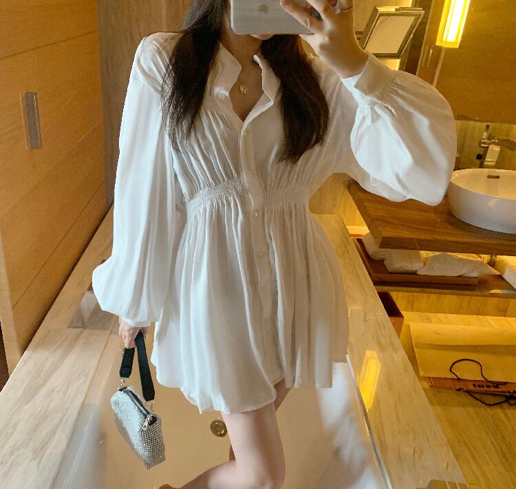 シャツスカートレディース2020年初秋新作スタイル気質ニッチデザインセンスウエストスリム長袖白ワンピース クレセントシティ5070068430