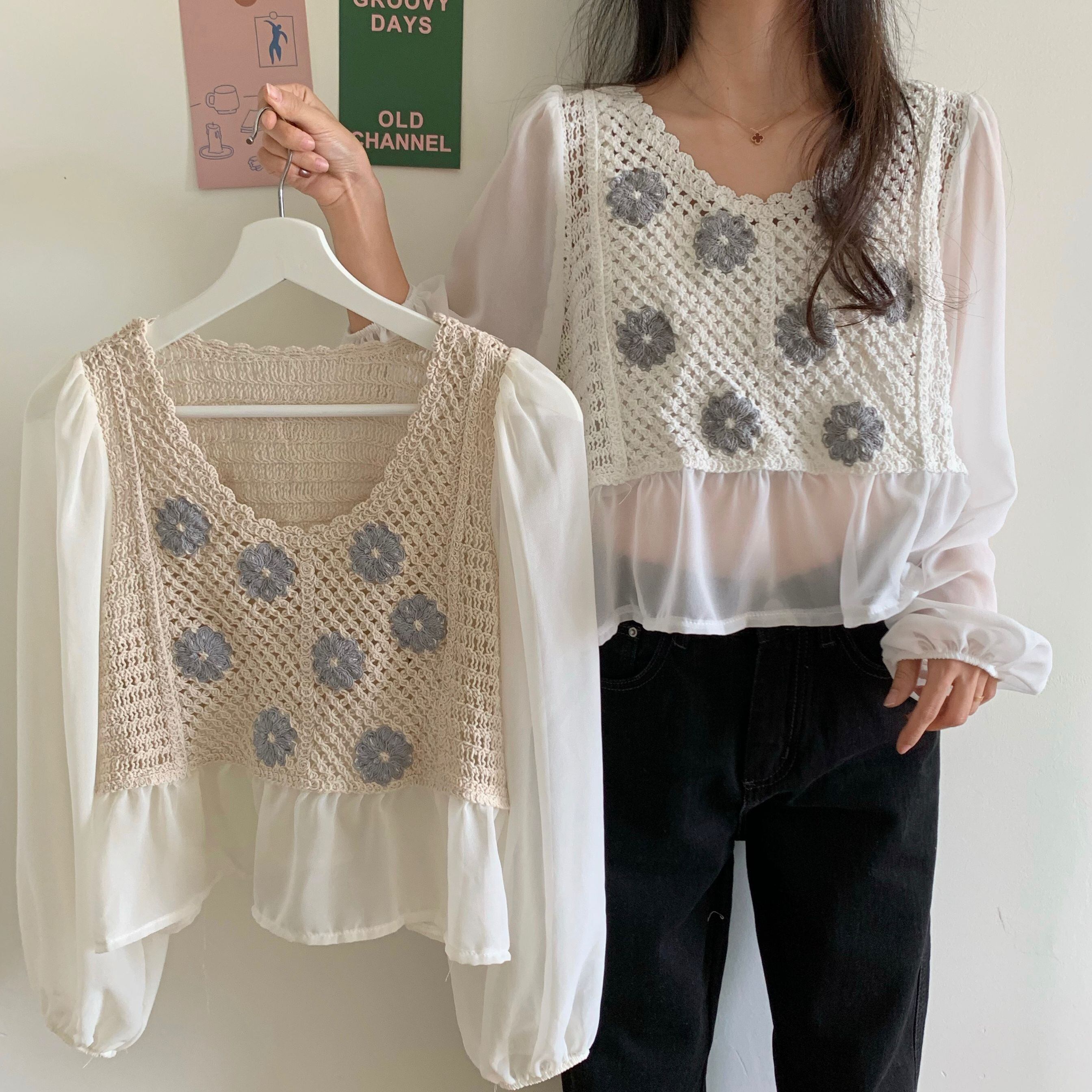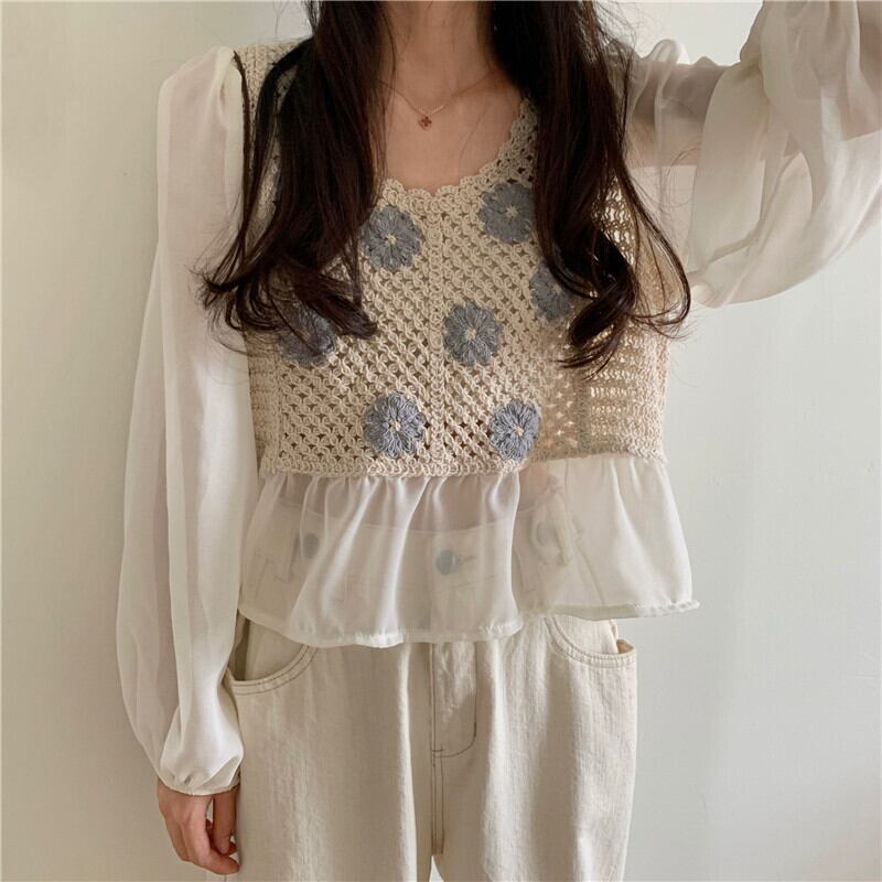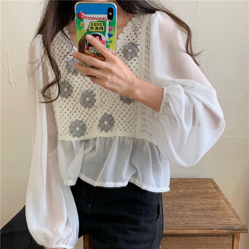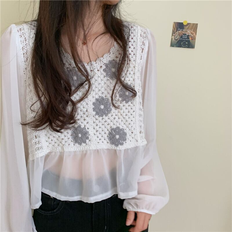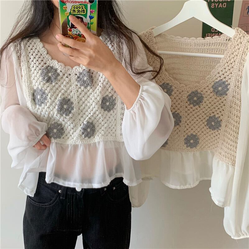 ニットセーターレディース2020年初秋新作フレンチデザインセンスかぎ針編みルーズショート長袖人形シフォンシャツ クレセントシティ56903098095