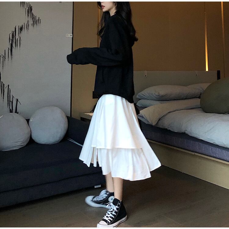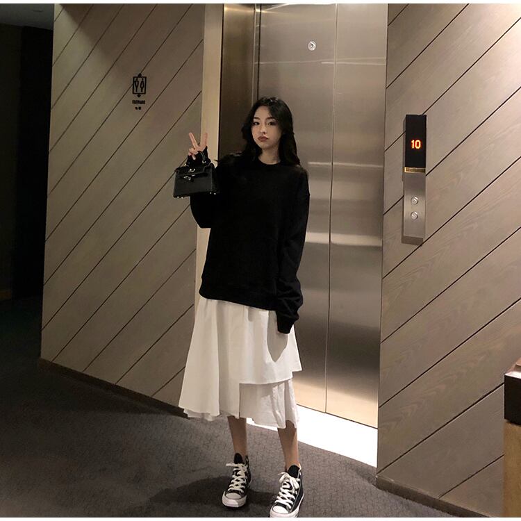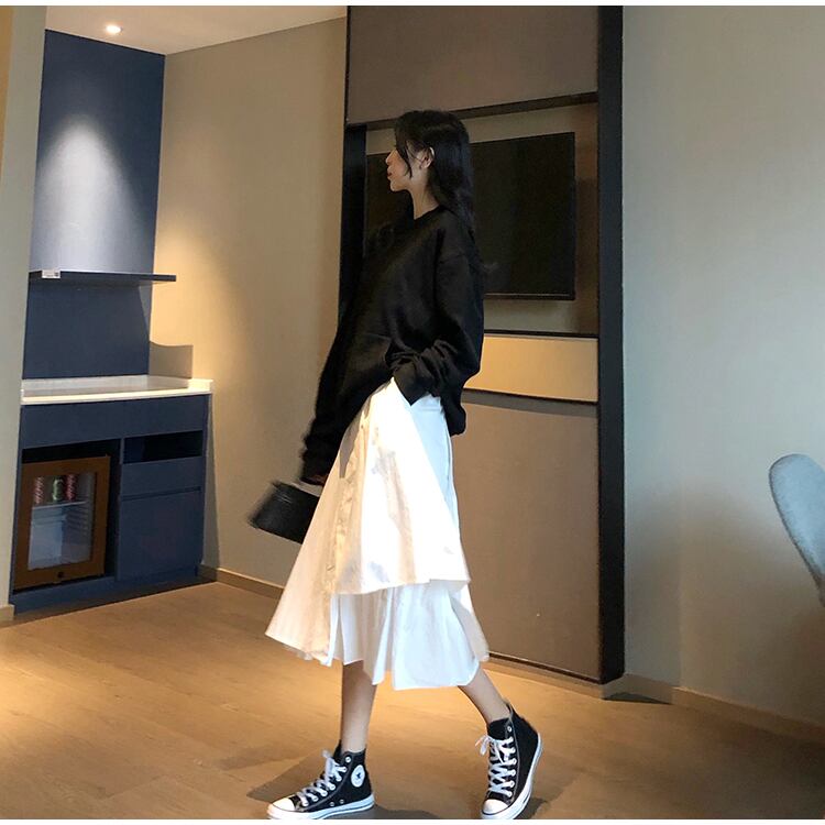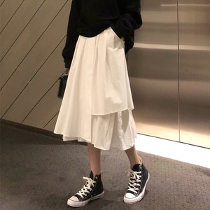 伸縮性ウエストイレギュラースカートレディース2020新レトロ香港フレーバーオールマッチハイウエストAラインスカート無地ミドル丈スカート クレセントシティ72734817723