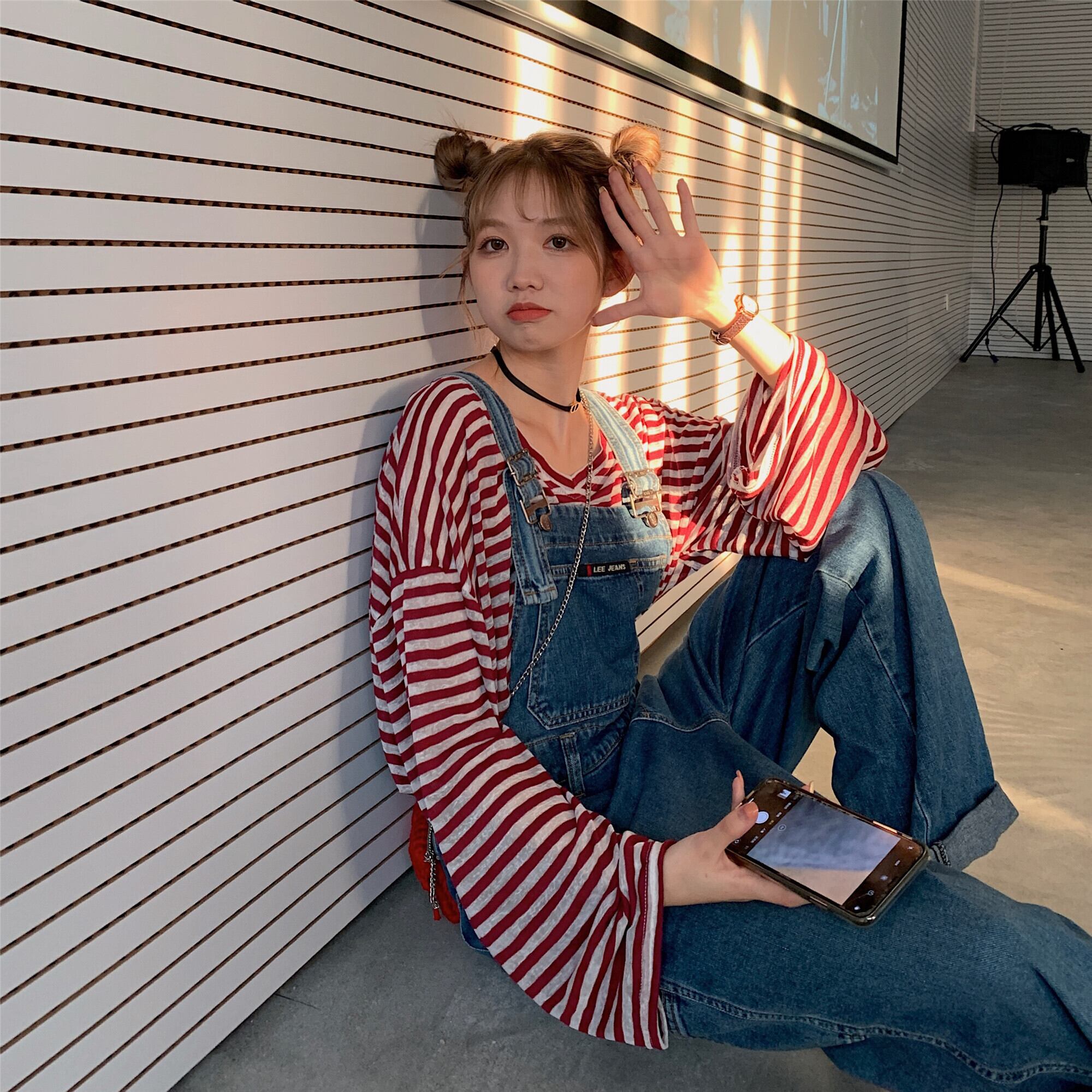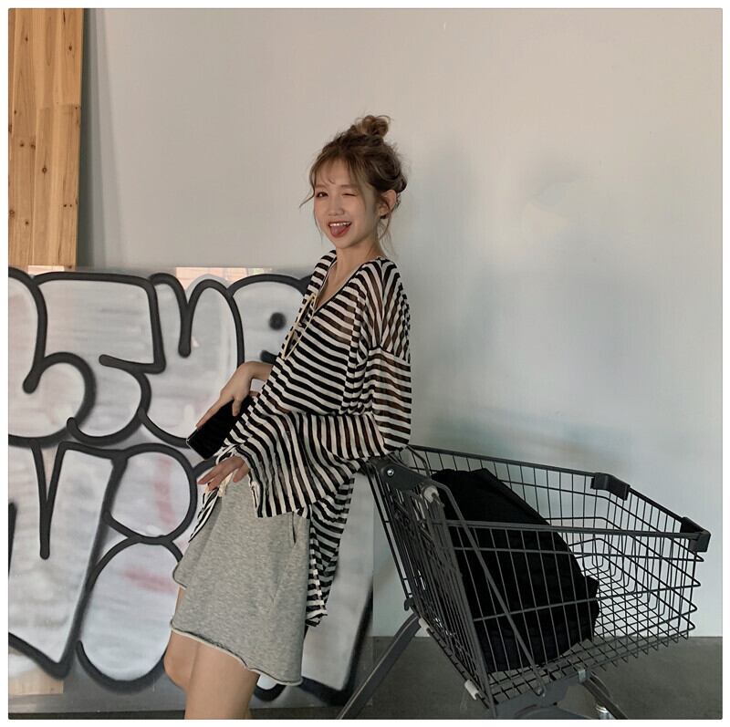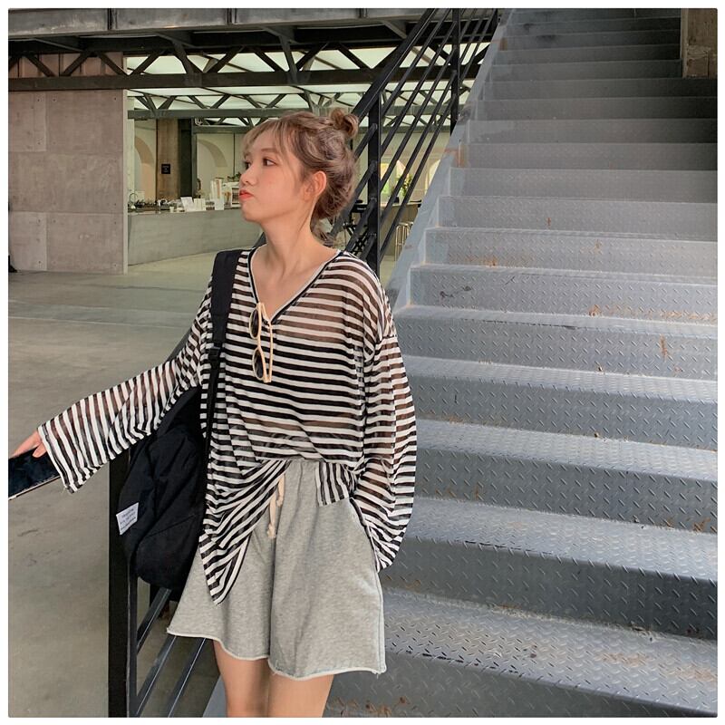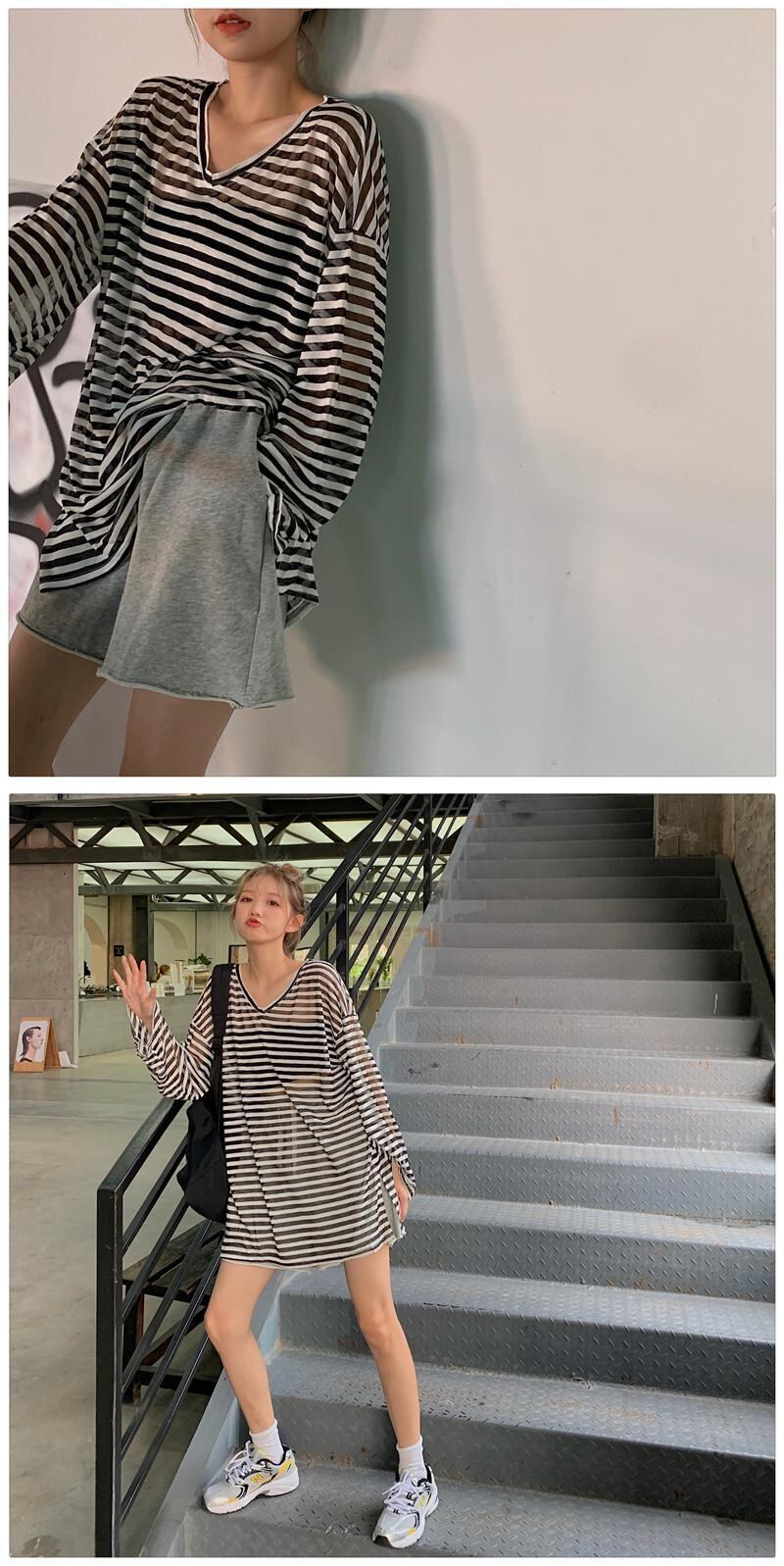 ストライプの長袖Tシャツ女性の2020年初秋新入生バージョンルーズで薄いスタイルとベースの日焼け止めシャツ クレセントシティ71060921714