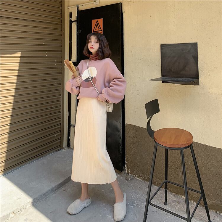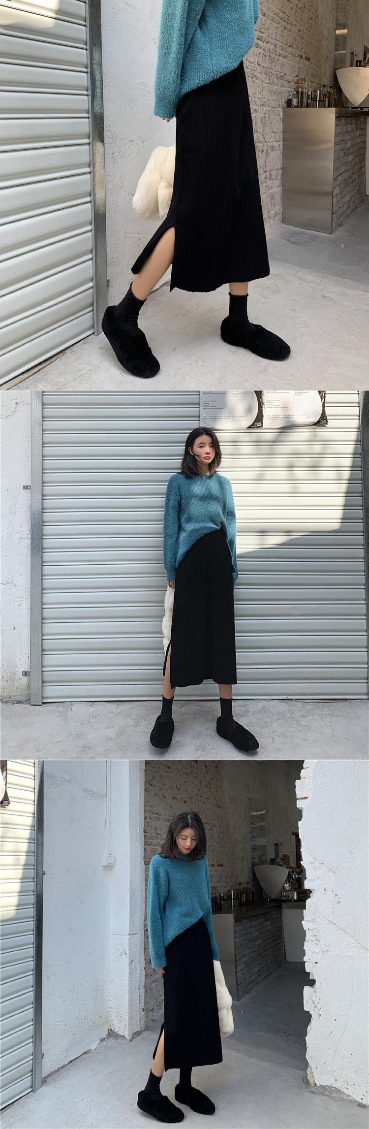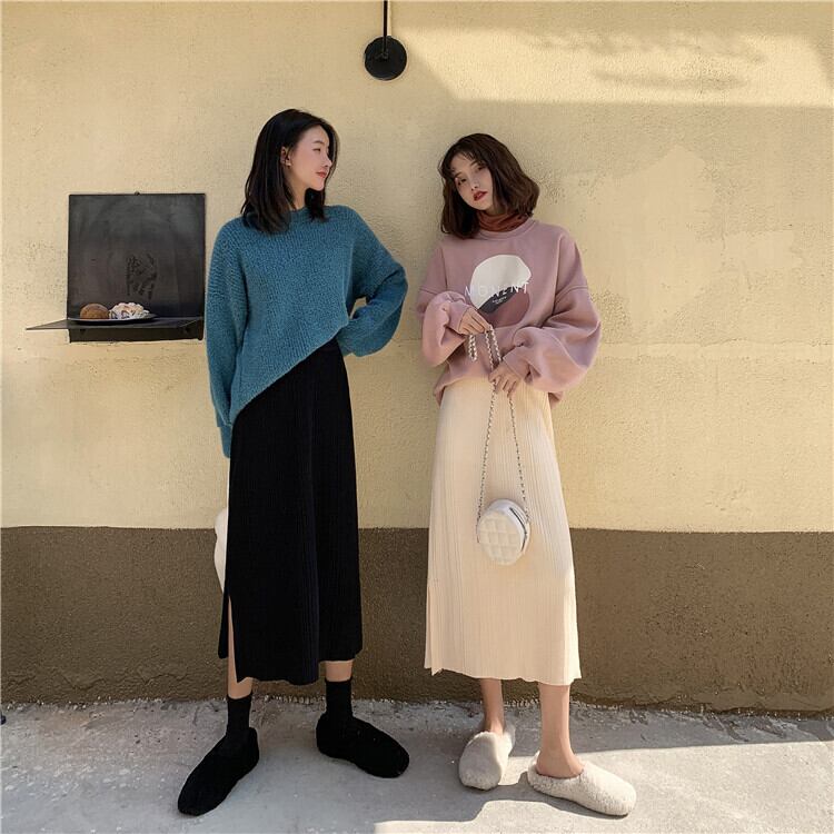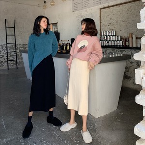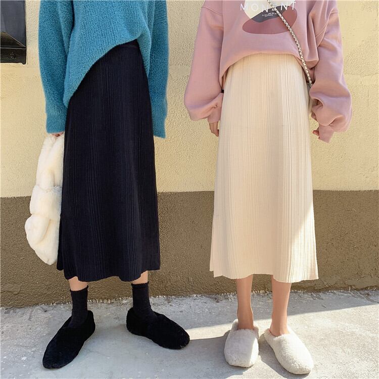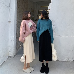 2020年新バージョンの無地ニットスカートレディーススモールトールウエストルーズサイドスリットミドル丈秋冬スカート クレセントシティ86105601303