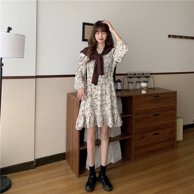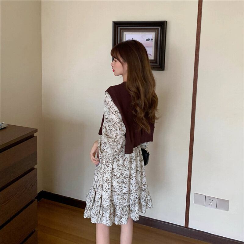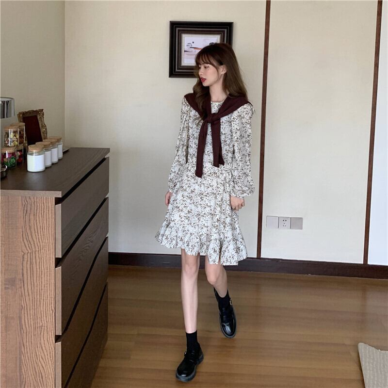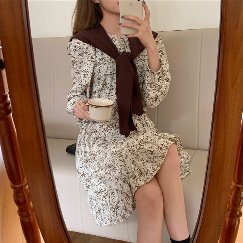 気質フローラルスカートレディース初秋2020ニュースタイルハイウエストルーズスモールAラインワンピース+コーヒーショール クレセントシティ82605154430