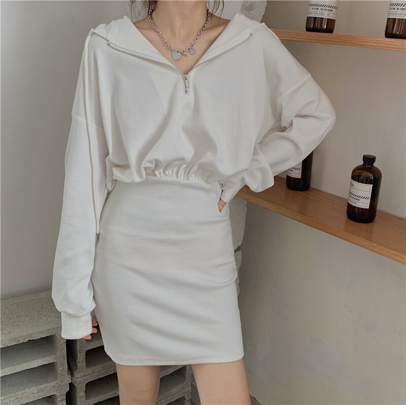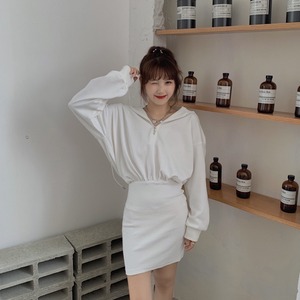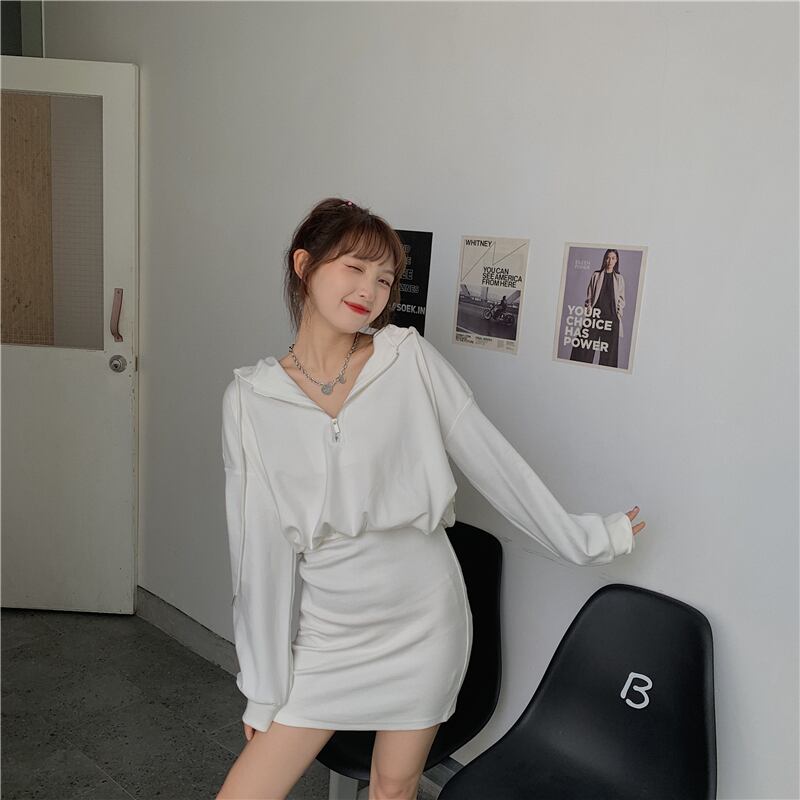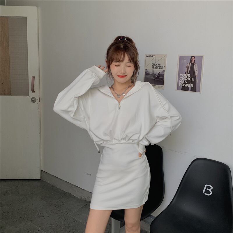 ピュアカラーのフード付きセータードレス女性の新しい2020年初秋ファッションオールマッチ学生ウエストと薄いヒップスカート クレセントシティ53706673782