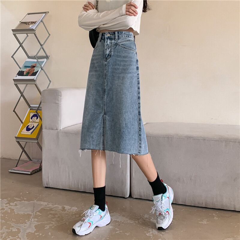 ブルー生デニムスカート女子2020年初秋新入生カジュアルスタイルルーズスリットミドル丈スカート クレセントシティ13906104689