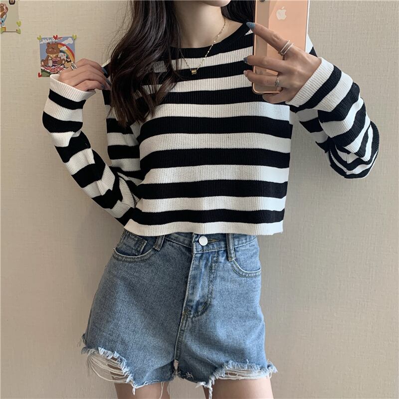 ストライプニット長袖Tシャツレディース2020年秋新バージョンルーズで薄いワイルドショートトップインタイド クレセントシティ18566773578