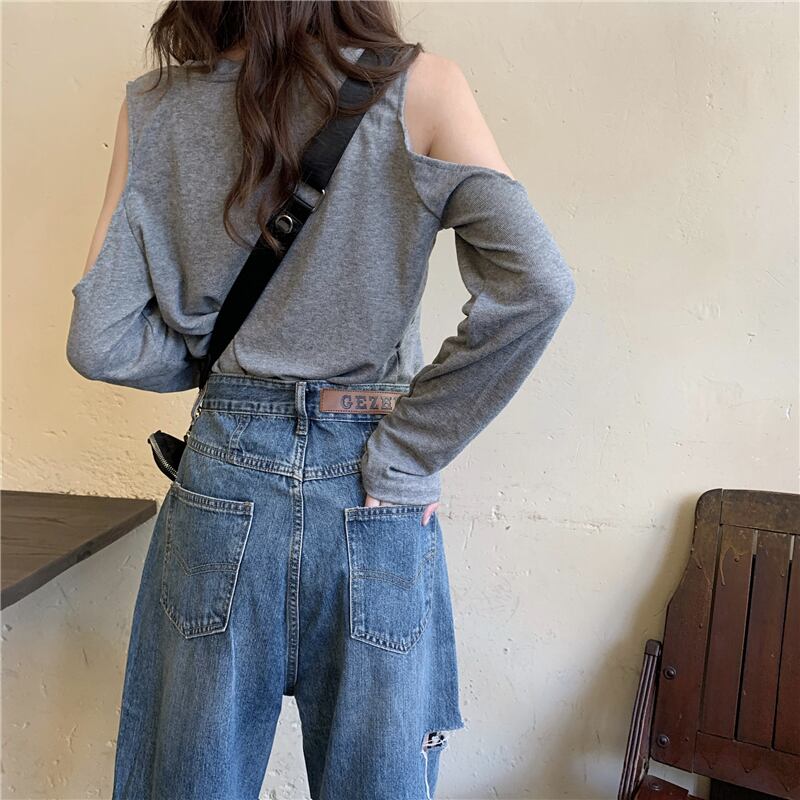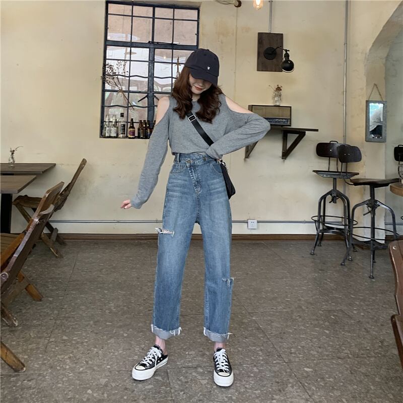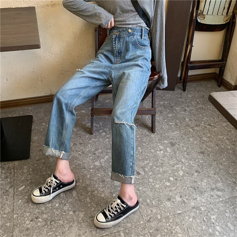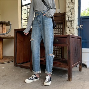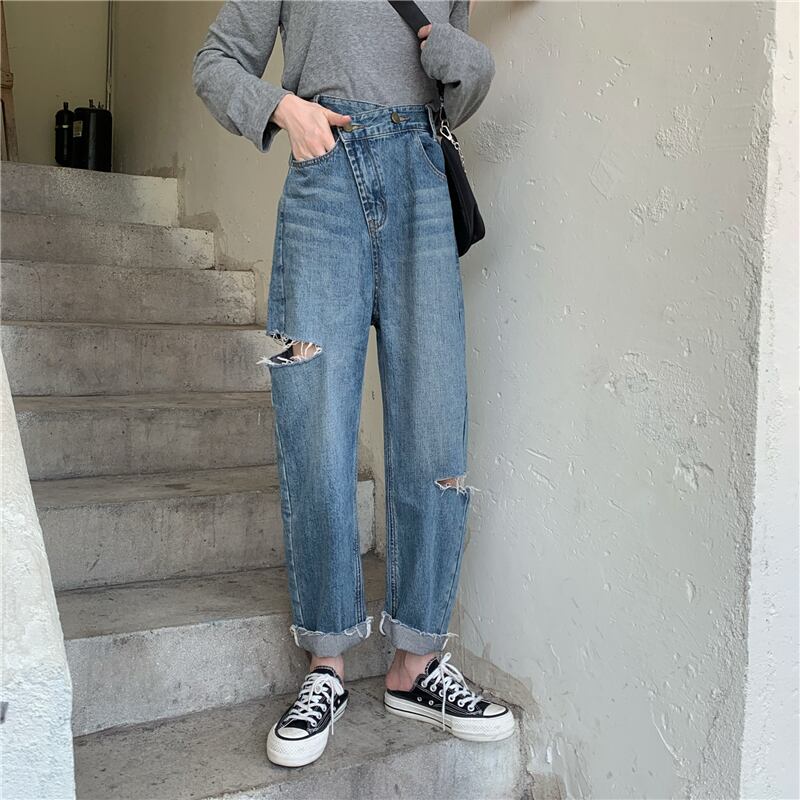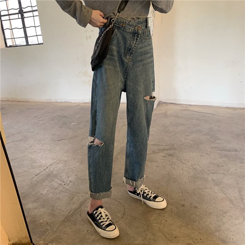 レトロジーンズレディース2020新バージョンルーズワイドレッグパンツ斜めバックルホールハイウエストスリムストレート9点パンツ クレセントシティ18500273431